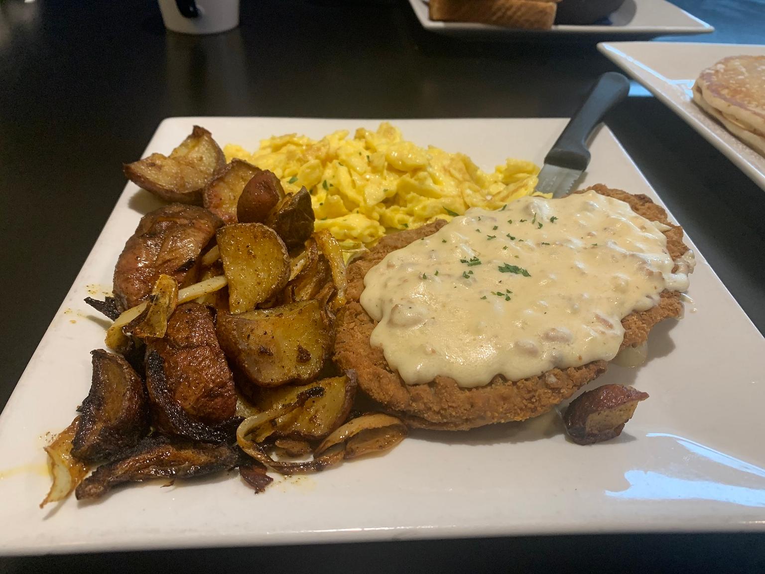 I’d been craving a country-fried steak for weeks, and Blue Plate did not disappoint. What I enjoy about country-fried steak is the saltiness. Steak is a heavy meat, and the relatively thin steak used for breakfast can still overpower even an intensive cooking process like frying if not done well. So in my experience, the best country-fried steaks are well seasoned to balance the steakiness of the meat and the potential heaviness of the fry. Blue Plate had seasoned the batter to perfection, and it melded together the tastes of meat and frying perfectly. The gravy was good too.