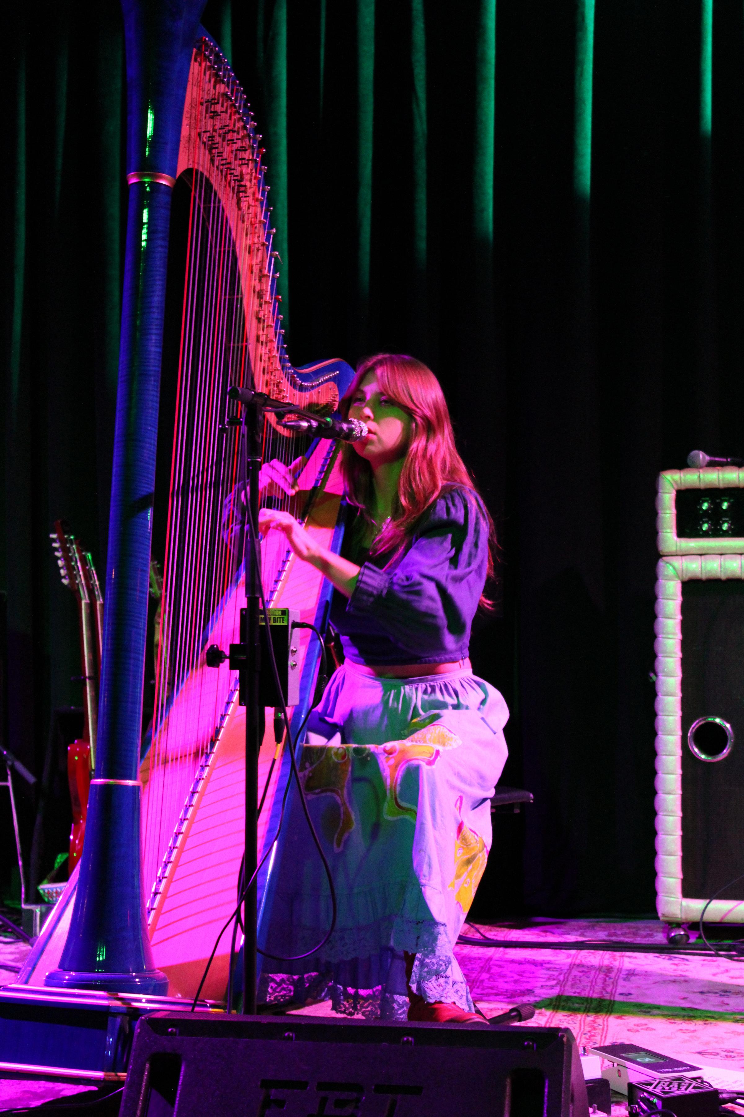 After a break, Mikaela Davis claimed her place center stage at the helm of her massive harp. It is impossible to describe a woman playing the harp without using words like angelic or ethereal, so we will get them out of the way here: Yes, Davis’s harp imbued the music with dreamlike resonance, but her music is rooted in earthy Americana, bluegrass, and 1970s folk rock, with heavy Grateful Dead influence. It doesn’t come across as retro or dated, though; instead, the effect is timeless. Her music could have come out last week, or it could have come out fifty years ago.