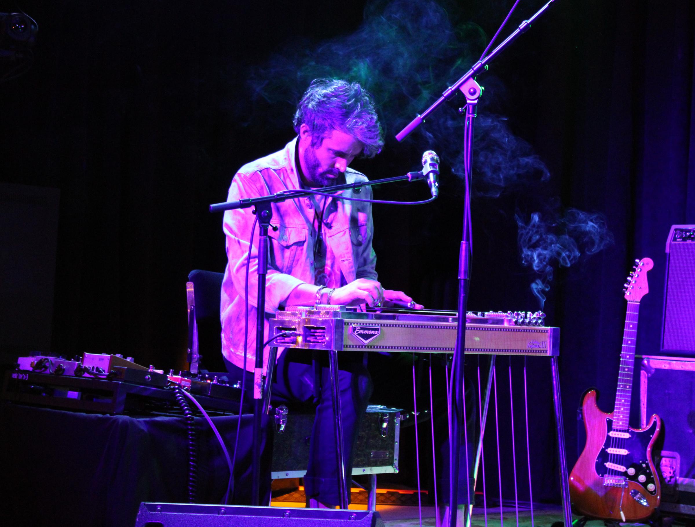 Psych pop quartet Maybird opened with a set of tunes that stirred the same bittersweet wistfulness one gets from a reread of Mrs. Dalloway. Every Maybird song feels like you danced to it many years ago, even if you’re hearing it for the first time. The group’s sound combines late ’60s psychedelia with energetic jam band beats and retro synth. They wear their anachronism on their sleeve: the band’s aesthetic is proudly 1970s, all denim jackets and flared jeans and long hair, guest steel guitarist Kurt Johnson playing barefoot with incense smoke snaking upward from his instruments.