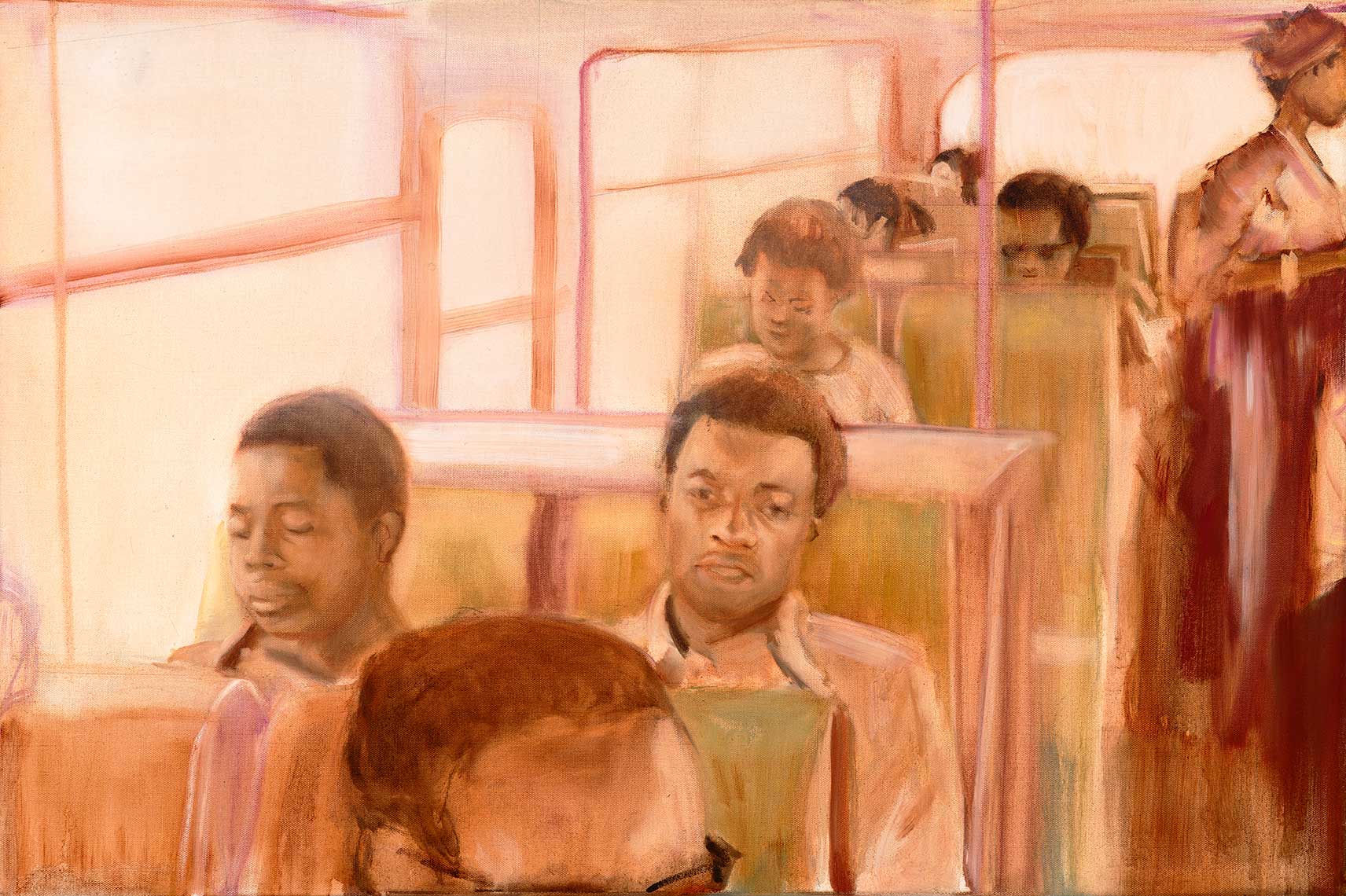 This is just one moment those golden threads of ancestral memory and tradition are being carried on through the show. Another moment, tying together his Nigerian roots, and his life here in Detroit is a simple painting of his father on the bus to see Stevie Wonder play FESTAC (the Second World Black and African Festival of Arts in Culture) in Lagos in 1977. At the time, it was the largest Pan-African gathering in history.