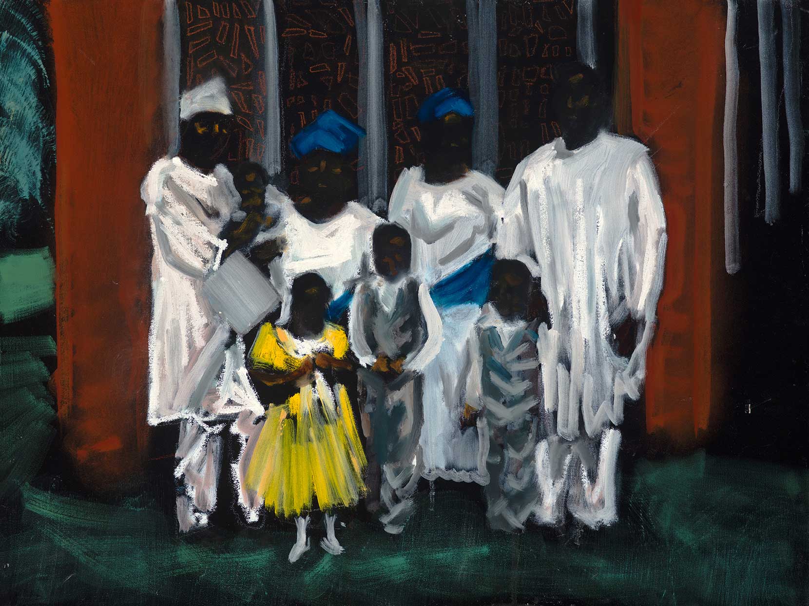 A painting of a group of women working in a shop in a Nigerian market invokes imagery of the Three Fates in Greek mythology, or the Norns of the Nordic pantheon who weave the destiny of all human beings. A faint golden thread seems to connect the women in the painting who have been captured in a moment of pause in the hometown of Ayeni’s mother, Ibadan.