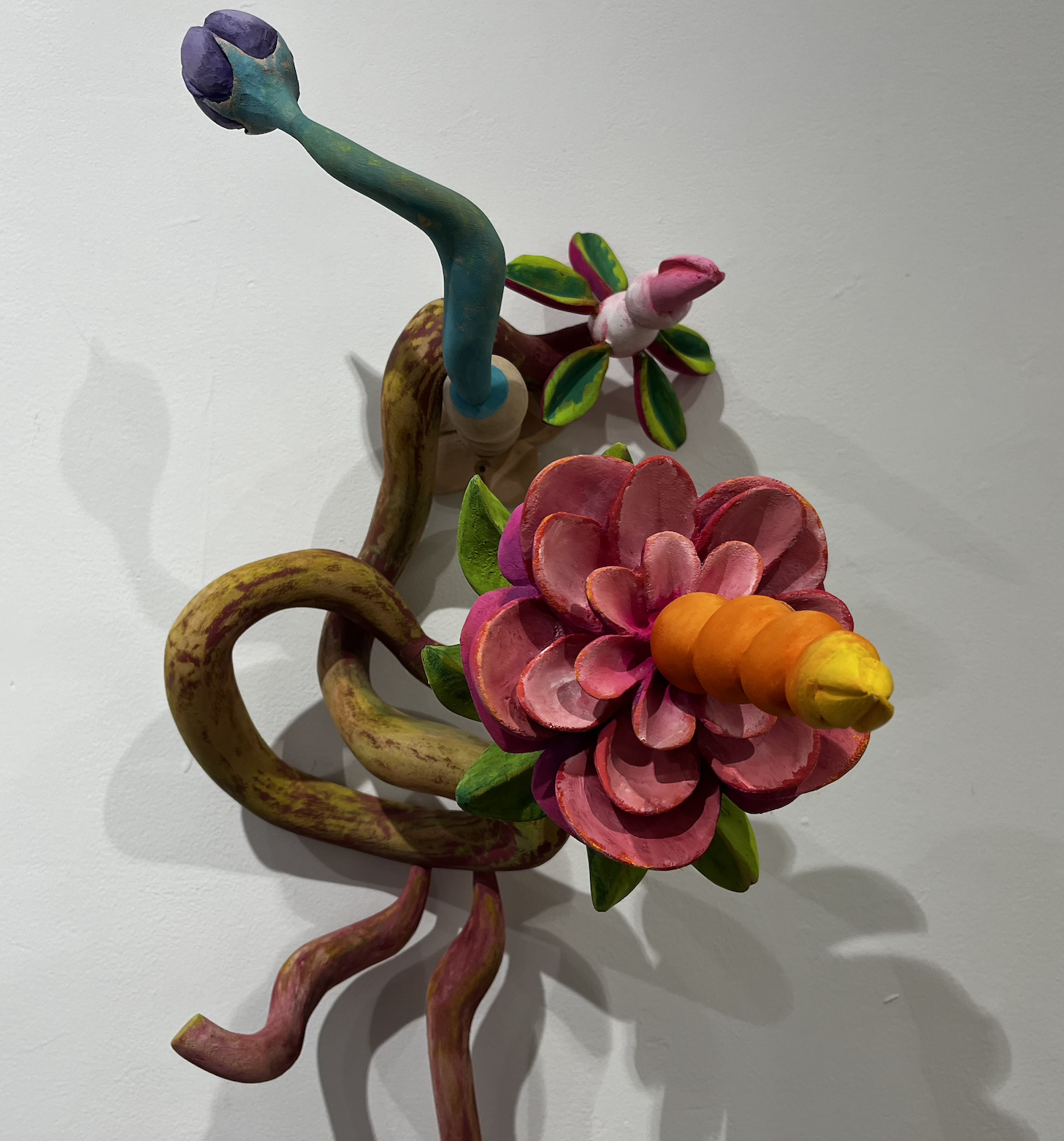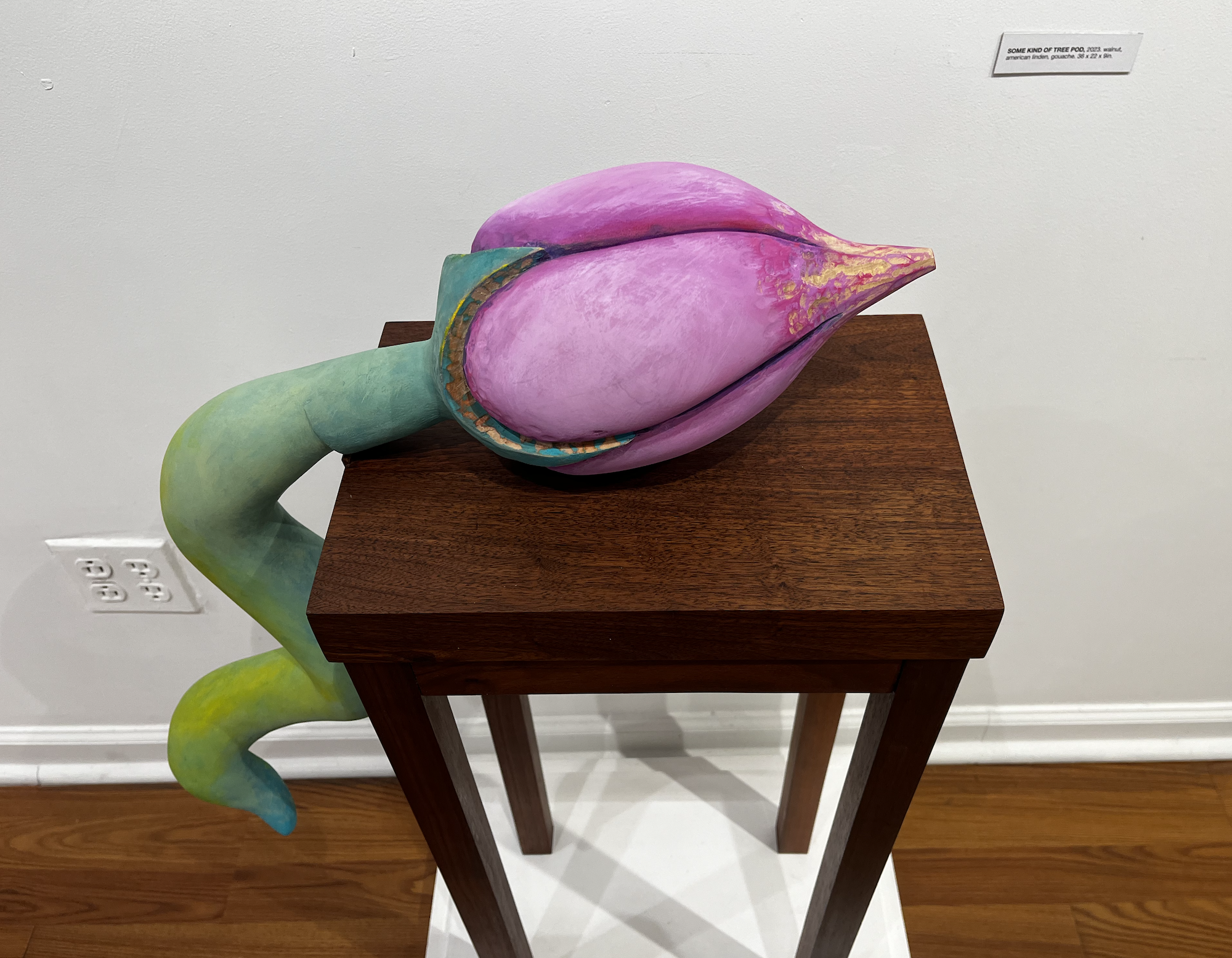 A giant pink bud, titled “Some Kind of Tree Pod,” balances on a podium, its vine curling off like a tail frozen in place. It, just like the shells, holds a sentient quality — it looks as though it could crawl right out of the gallery.