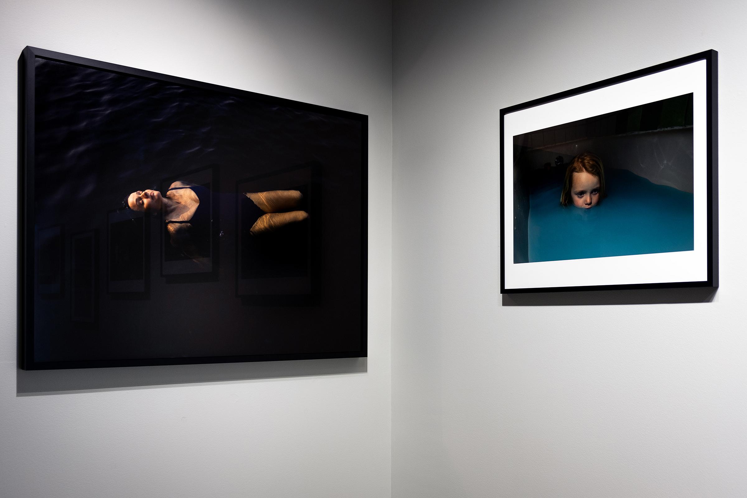 Much of the metaphorical depth of the show comes from the editing and sequencing, which draws photographs into conversation. In one corner, McClure lies face-up in a dark body of water, and in a separate image on the adjoining wall her daughter lies with her face half-submerged in the blue water of a tub. Other small moments come together and fall apart. In two separate portraits hung next to each other, McClure and (presumably) her husband appear — McClure with only her chin illuminated by light, her husband’s face lost to darkness other than his eyes — almost as if together they make up one complete portrait.
