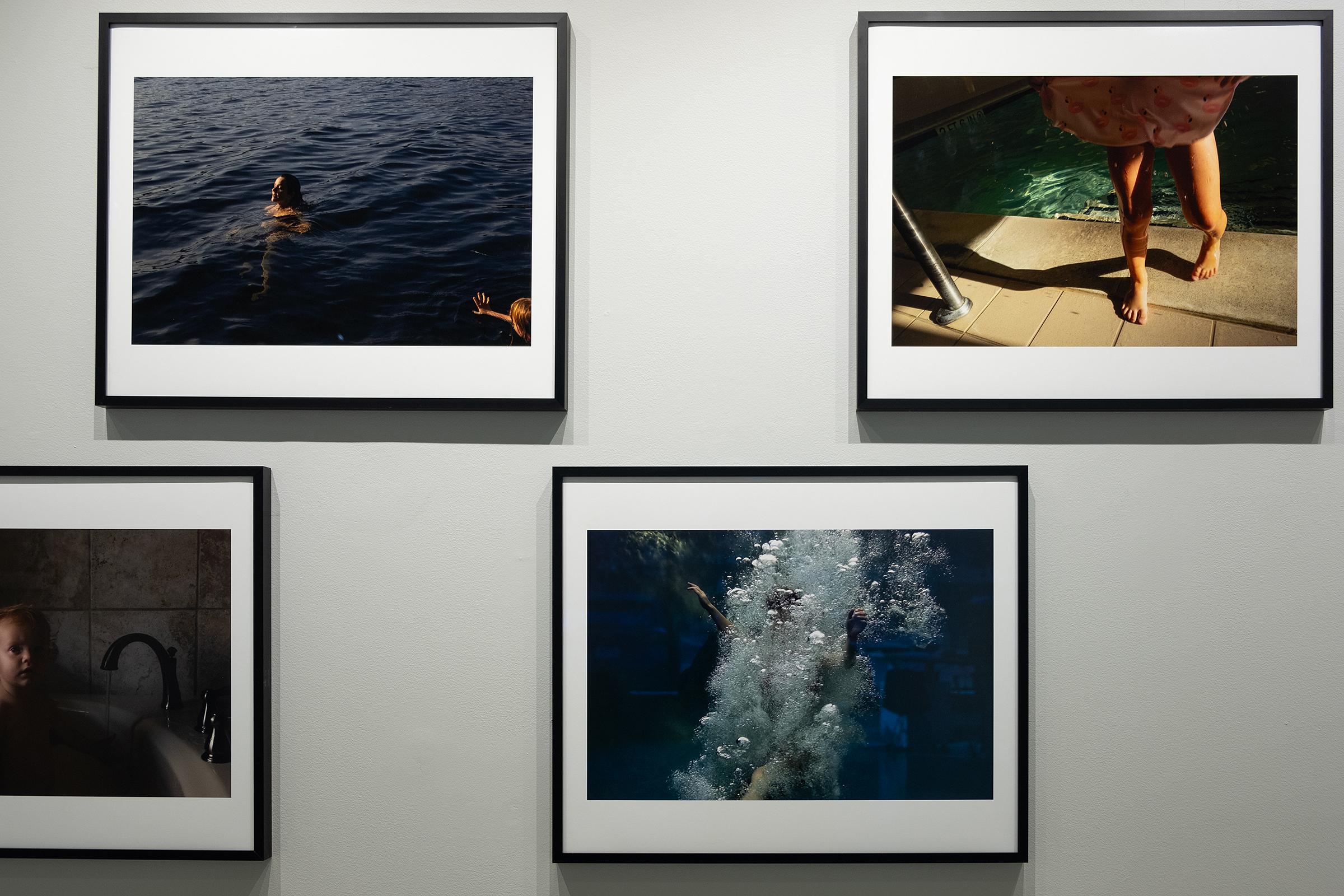 Still others are more evasive in their meanings and filled with looser, less resolved metaphors. Water is pervasive throughout the exhibit, shifting and refracting in each repetition. In one image, her daughter sits in a patch of light at the top of the stairs of a pool as the water sinks into darkness beneath her, and in the next image she is being lifted out of a dark bathtub into the light. In one image the daughter holds her hand under a running faucet with a quizzical look at the photographer, and in another she seems to push her mother away floating in a large body of water. Some are dark, some play with light, some are hopeful, some are sad, but in all the water seems to remind us of the deep depths that we might fall into at any time, at once terrifying and suffocating and unknown, as well as cleansing, pure, and quiet.