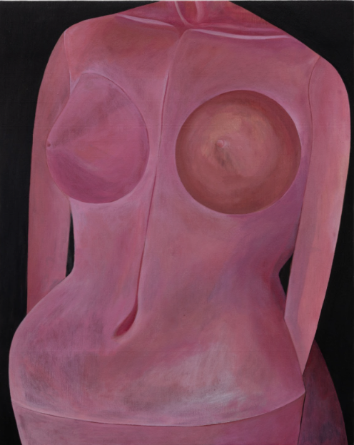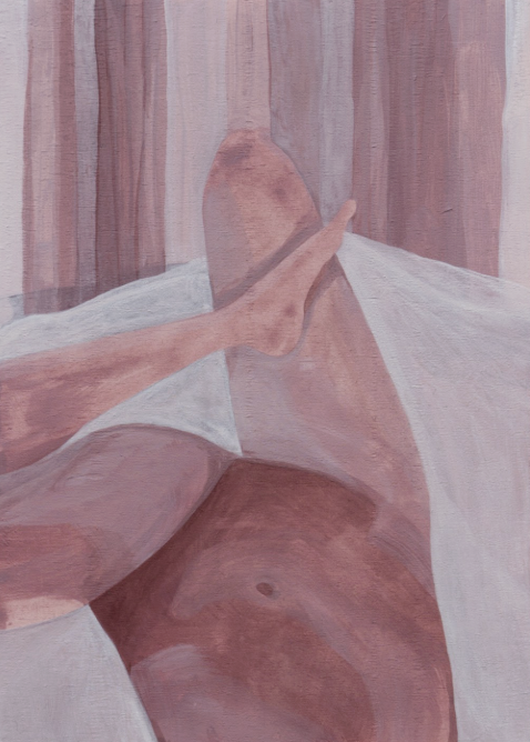Cedar sustains this cramped feeling through her miniature paintings of tessellating subjects, like “Lay,” which depicts a stack of gray seals leaning into one another’s bodies like fat droplets of ocean water joining forces; or “More,” which shows a curved hand hovering over an endless wall of purple puzzle pieces. “Talk” illustrates the naked bottom half of a woman with knee crossed over thigh in bed, maybe chatting on the phone while her pink skin blends into the raspberry striped wallpaper.