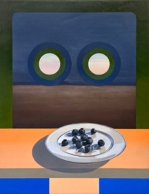 Whereas Cox utilizes a trompe-l’oeil approach and Pater a flattened, hyperrealistic one, Cedar approaches the theme of stillness through a mushier, cartoonesque style.