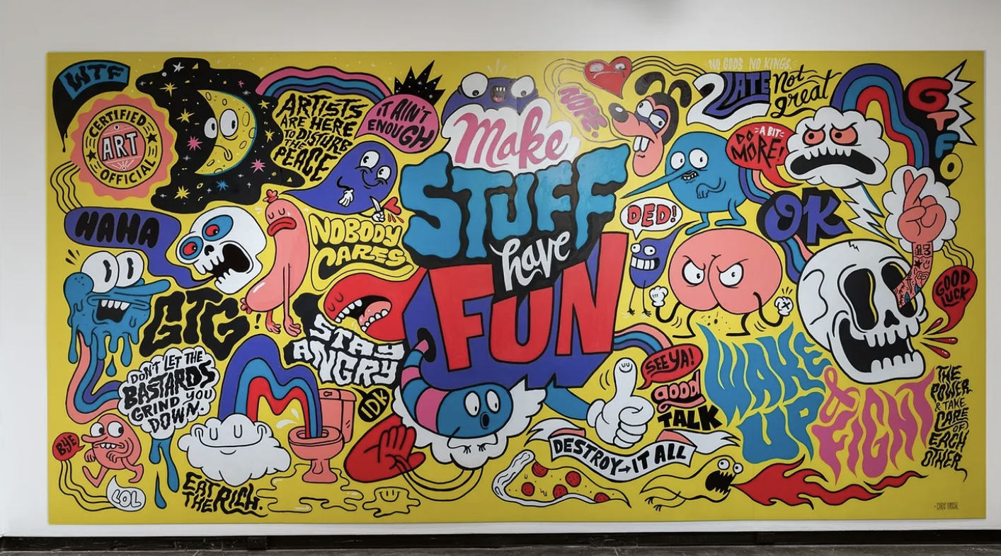 Beyond the images though, the mural is a mishmash of conflicting messages in written form. The largest message, placed at the center of the mural, exhorts the viewer to “Make stuff have fun.” However, negative messages surround the positivity. “Nobody cares”, “Stay Angry”, “Destroy it All” and “Ded” ring the central message.