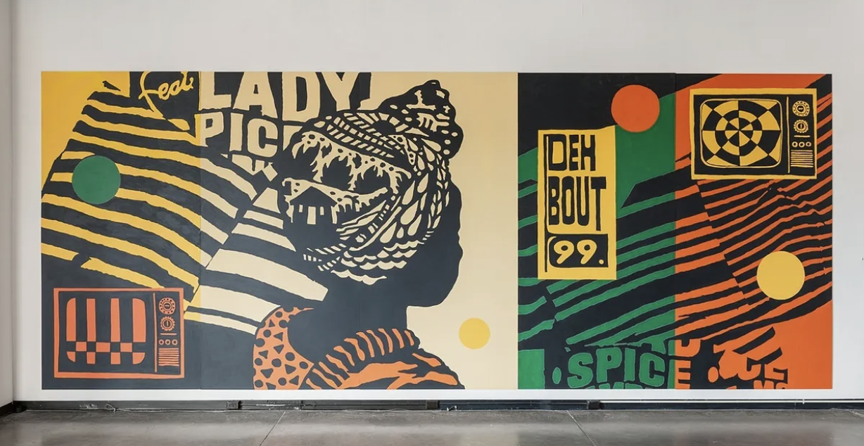 Where Piascik’s mural is in your face, I was pleasantly surprised by the subtlety of Vaughn Fender’s mural. The piece seems straightforward at first, featuring a Black woman looking off into the distance and televisions in the upper right and lower left corners. The color scheme is evocative of much of the art of the African diaspora, although it noticeably omits red in favor of yellow and orange, which gives the artwork a calming feeling that seems more like a yearning for home than a statement about the violence of the diaspora, which so much art tends to focus on.