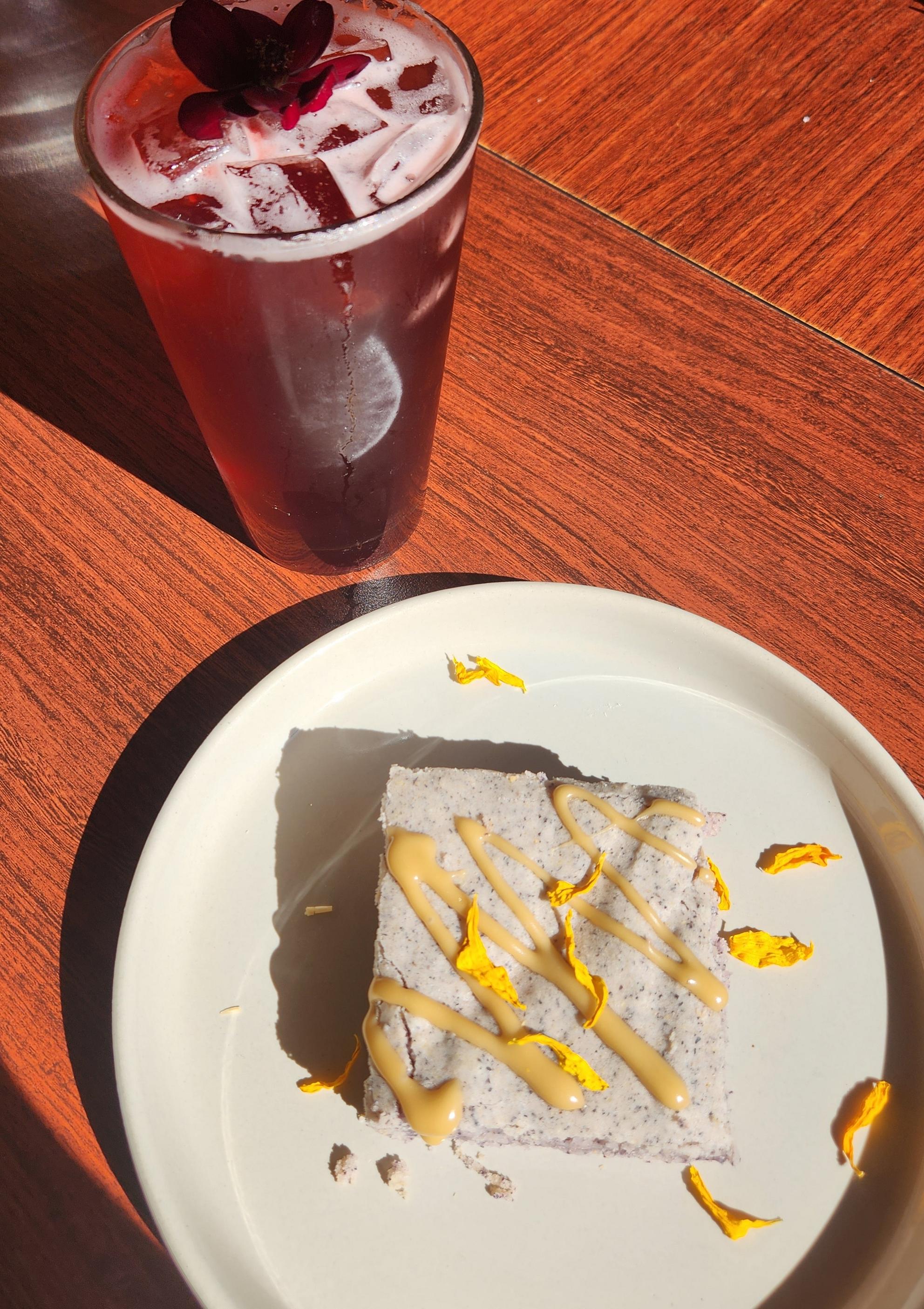 The elderberry spritzer had a mild soapy funk to match the tart, which I like though it may not be everyone’s preference. The berries are medicinal and have been used for immune support for a long time, not to mention the lovely deep cranberry reddish-purple they produce (aesthetic, especially when paired with the flower the glass was topped with).