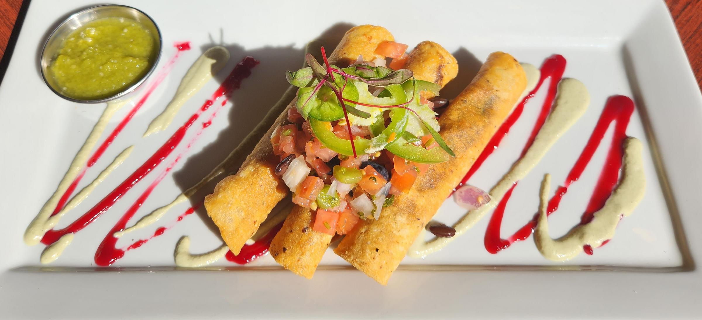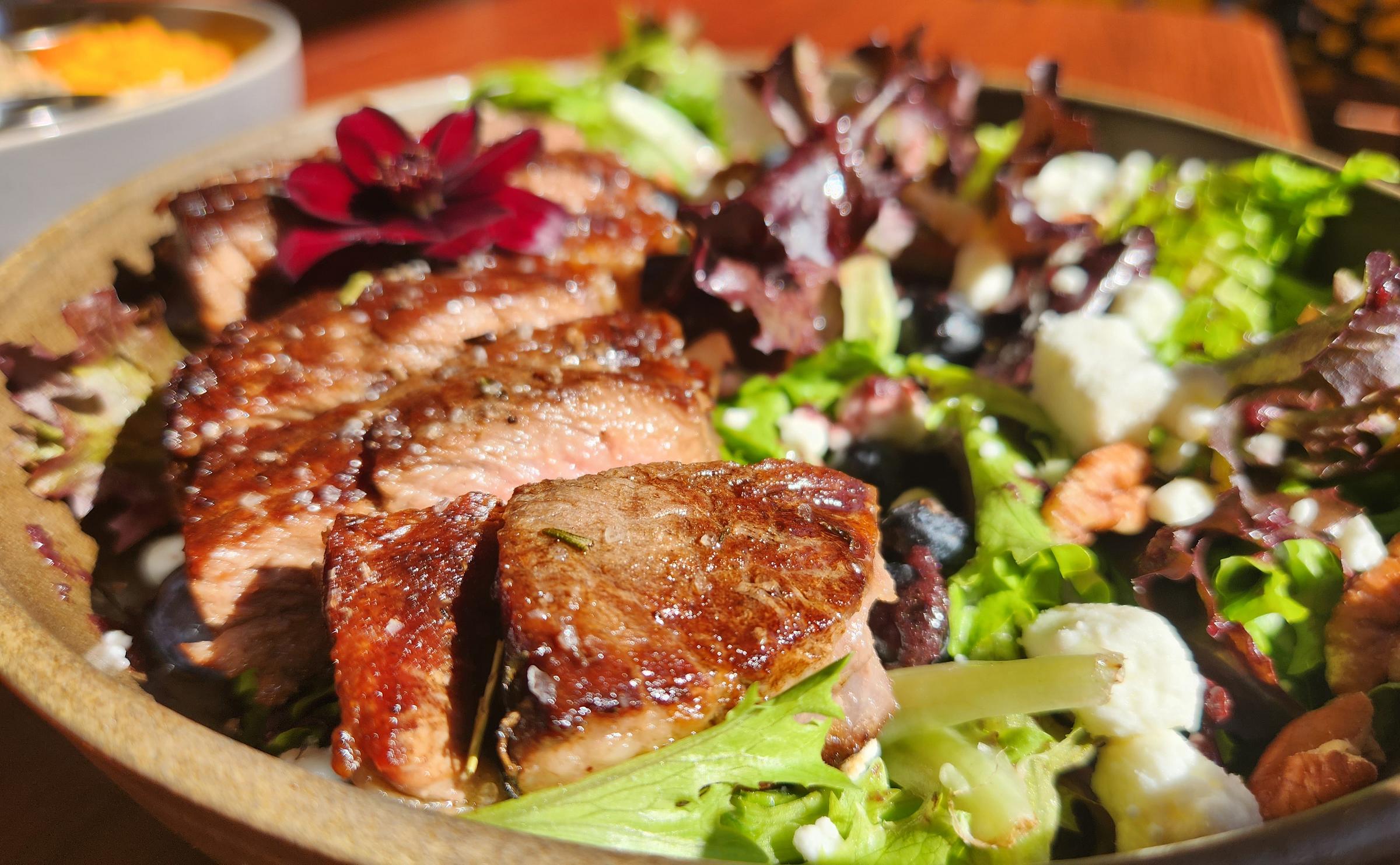 On a recent visit, a friend (a carnivore) and I went in fast and hard with our order: cornbread with berries and maple ($6) to start, sweet and white potato hibiscus taquitos ($14) to follow, an elderberry sparkler ($8) to whet our whistles, and finally a bison salad ($25, ordered medium rare) for my friend Fernando and a three sisters veggie bowl ($20) for me.