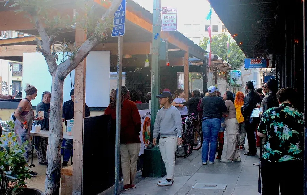 I ordered a beer at the Black-owned, LGBTQ-friendly bar The Hatch, next door to Nectar, and sat in the parklet outside while I waited for the party to ramp up. Adjacent to the parklet of Nectar, a woman wearing a “Filipino for Black Lives” T‑shirt whipped up delicious smells alongside a younger Black woman behind a banner that read, “The Lumpia Ladies.”