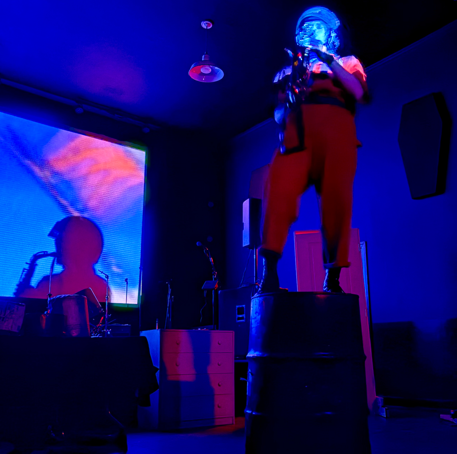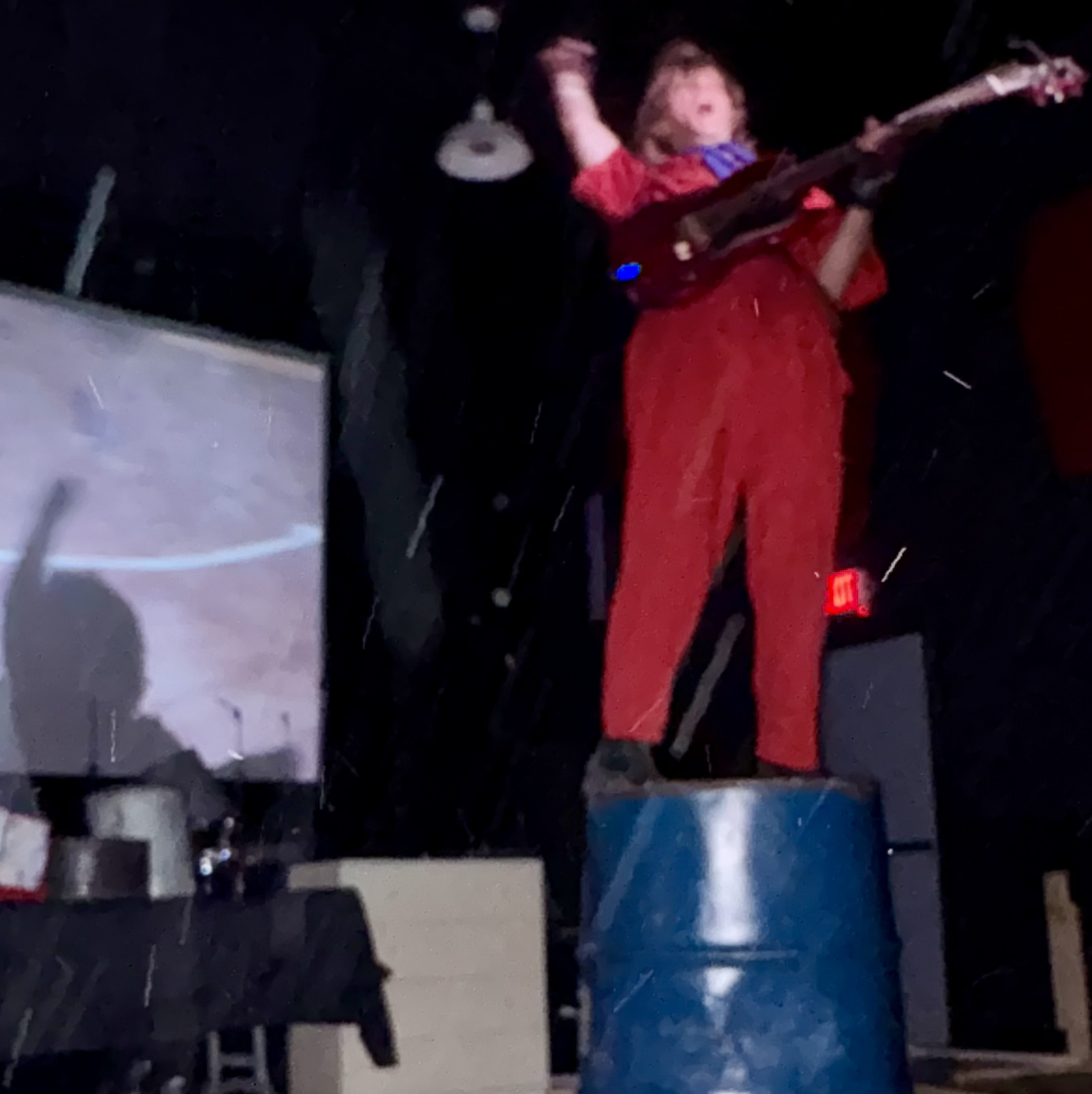 I’d be remiss not to briefly shout out the next performer, the local multimedia artist Holden Linton. Donning a red jumpsuit, brown boots and belt and a racing bike helmet, with blonde Asgardian locks and a Mr. Incredible jaw, he was a sort of Evil Knievel in repose – until the set began. Some artists are accused of “pulling out all the stops,” but how many show up to the gig with an actual oil drum filled with flotsam and jetsam, a table and a doorframe and a dresser and a sledgehammer and a saxophone and a guitar and caution tape to ward off the crowd from getting too close? Watching him set up brought back Pay-Per-View visions of Extreme Championship Wrestling. This was capital-p, capital-a, probably-should-have-signed-a-waiver-for-this Performance Art, and I loved it for its genuine, unpredictable power. Linton’s projected visuals were telling a personal story and were in no way a substitute for a dearth of powerful live imagery: when he wasn’t literally destroying objects, he was teetering on a high perch, perilously blasting saxophone (I asked his mom, standing next to me, “Does he know how to play it?” and she laughed, saying, “Not really, he just got it”) or veering abrasively between spoken word, shouting, drumming and noise; it was a high wire act, a highly-choreographed theater of intense objects, both inanimate and flesh. Linton’s maximalist muchness actually felt like a lot, in a good way, plumbing mythic grandeur from found objects. We all teamed up with brooms and shovels after to clean up the incredible mess.