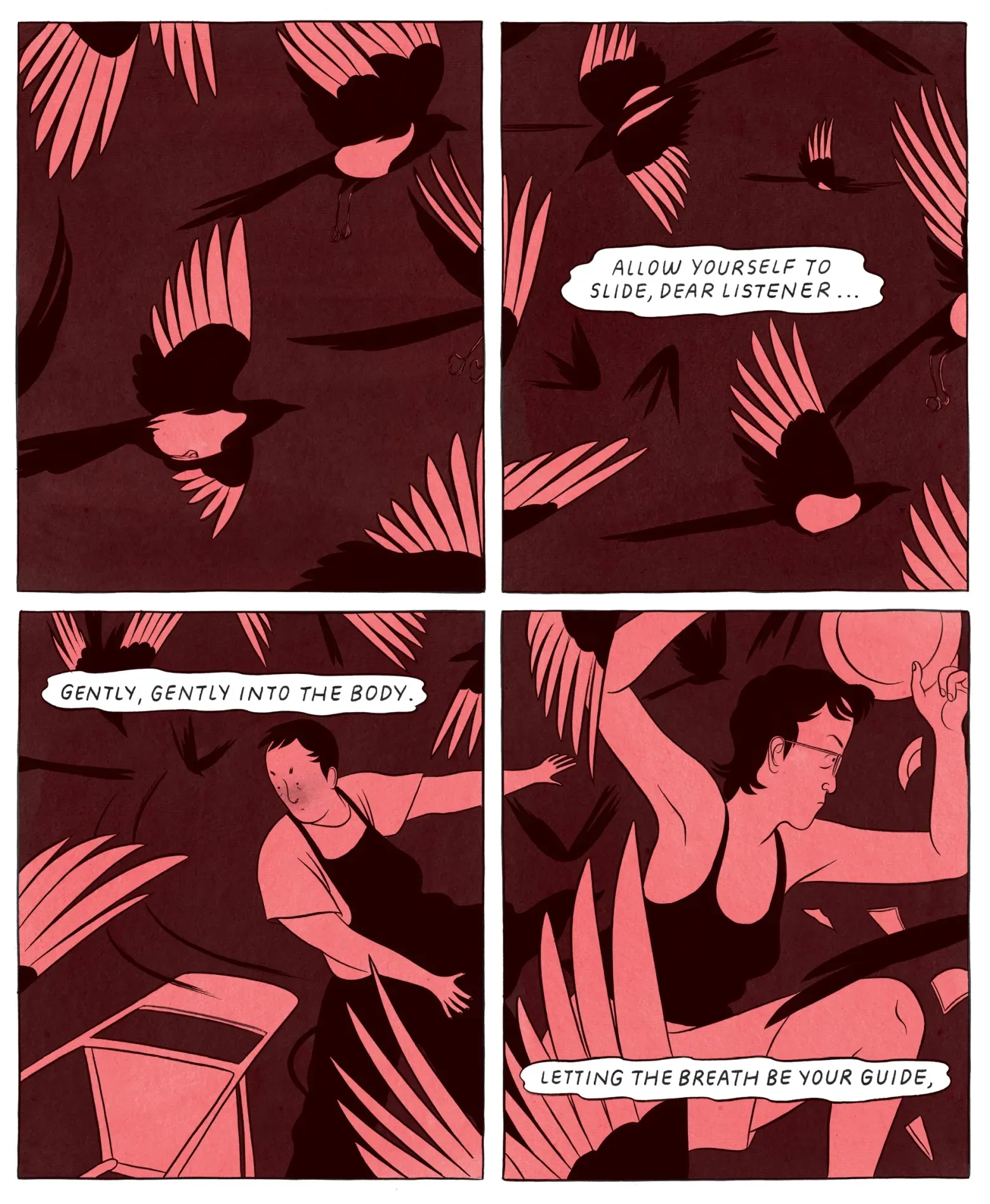 Over the course of the graphic novel, Cannon takes care of her aging grandfather, wedges herself into uncomfortable shapes to make her hangouts with Trish run smoothly, and goes on meditative runs that tear up her feet just so she can manage a dysfunctional work environment day after day. Everyone keeps telling her how good and calm she is. It’s a harrowing tale.