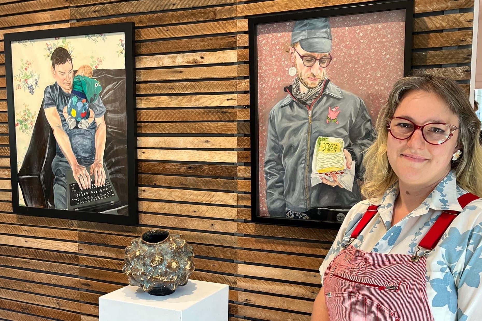 Described as an exhibition that explores “the ways that the natural world and human forms intersect in both everyday life and the imagination… motifs that evoke memory, emotion, and transformation,” the show featured four artists and included paintings and sculptural work. Overall the exhibit didn’t seem to me to fully reflect its theme—one I found vague and ambiguous—but Madelyn Covey’s figurative oil paintings came closest to ‘everyday life’ and ‘memory’. Painted on found wallpaper, the works depict figures in the middle of things, such as a couple on a bed with some dogs (pictured at top), a sleeping man, and a person holding a Japanese omelette (tamagoyaki) fashioned into the shape of cartoon character Spongebob Squarepants. They’re quiet paintings, rendered with careful execution. I felt them to be a bit too quiet, almost staid. Ms. Covey, a pleasant and friendly personality based in Richmond, facilitates painting and drawing at Creative Growth Art Center.