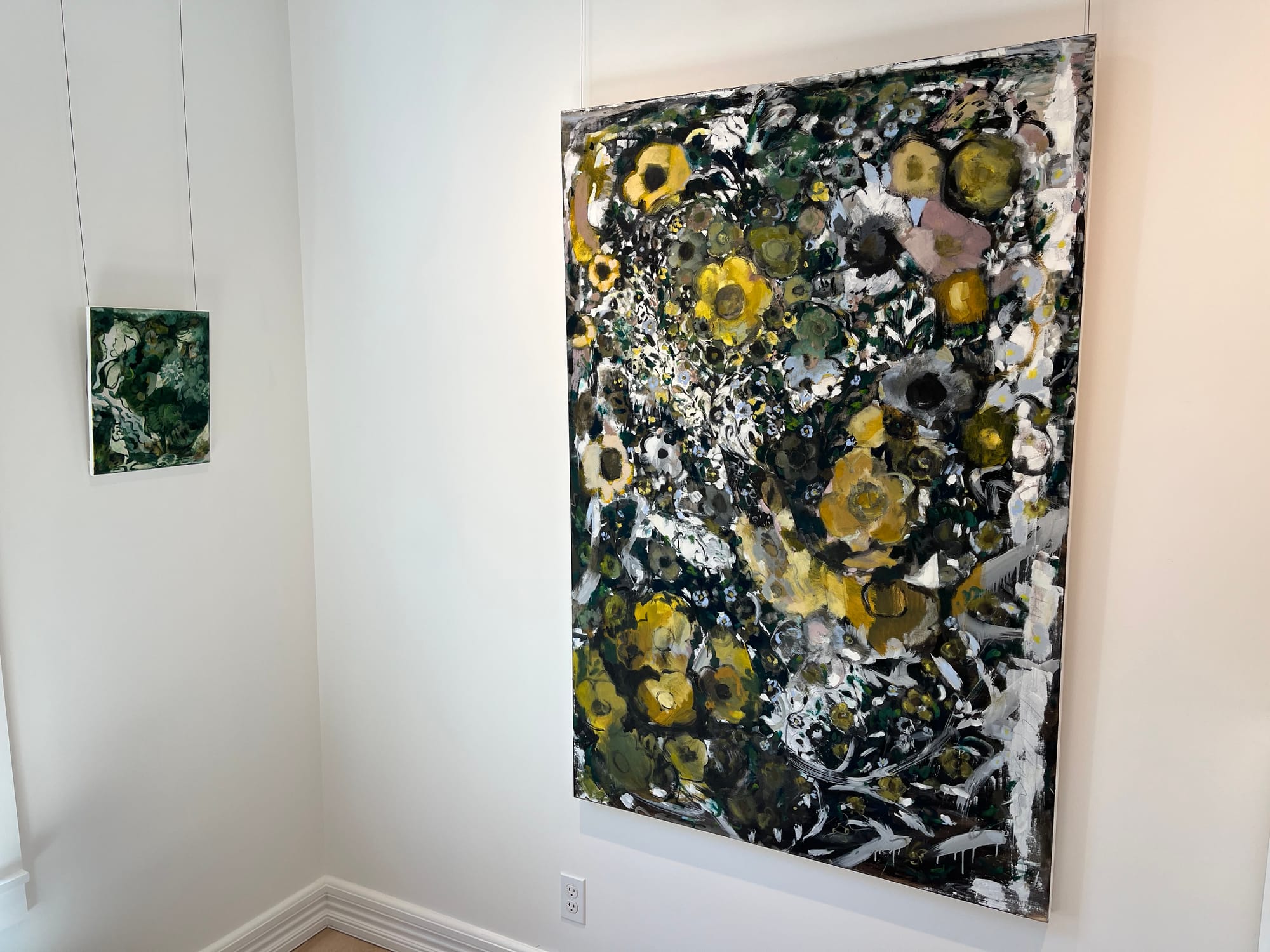 Freer, more adventurous, and more aligned with the ‘intimate nature’ portion of the concept were two oil on canvas paintings by Claudia Morales. Her floral abstractions possessed a sense of constrained energy which made me linger. The compositions, and the color palettes—greens, golds, white, and subtle rosy pink—were unified. It’s too bad there were only two of her works on display (one looked minuscule in its proximity to the larger work). Born in El Salvador, Morales emigrated to the U.S. at age 5, and has been making art full-time since 2008.