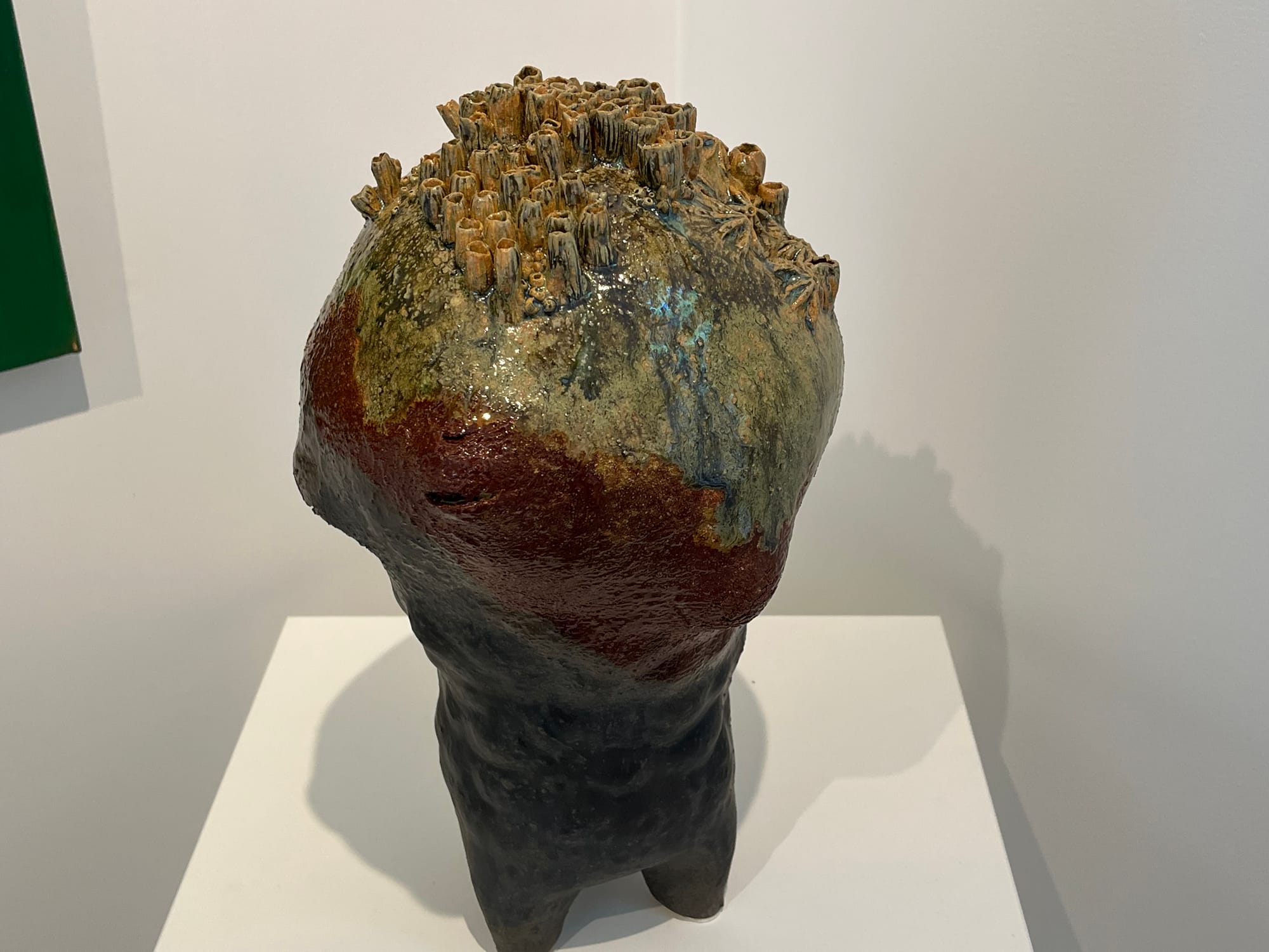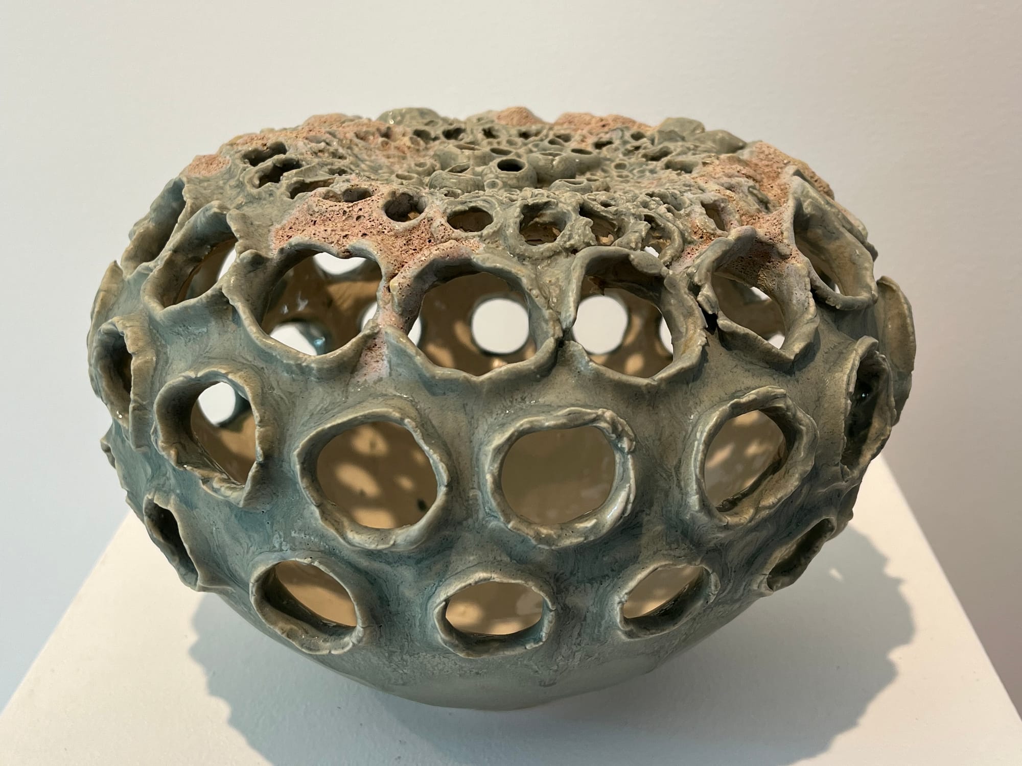 I loved Kathrine Worel’s stoneware works, the strongest of the show. Eight of her ceramic pieces were on display at Dictée (as well as three mixed media on paper works on the walls). They’re elegant, organic-looking creations with mysteriously subtle glazes, some of which look like they have barnacles living on their surfaces. Carefully and thoughtfully crafted, they invite the eye to explore and tempt the hands to touch their many different surfaces and tantalizing textures.