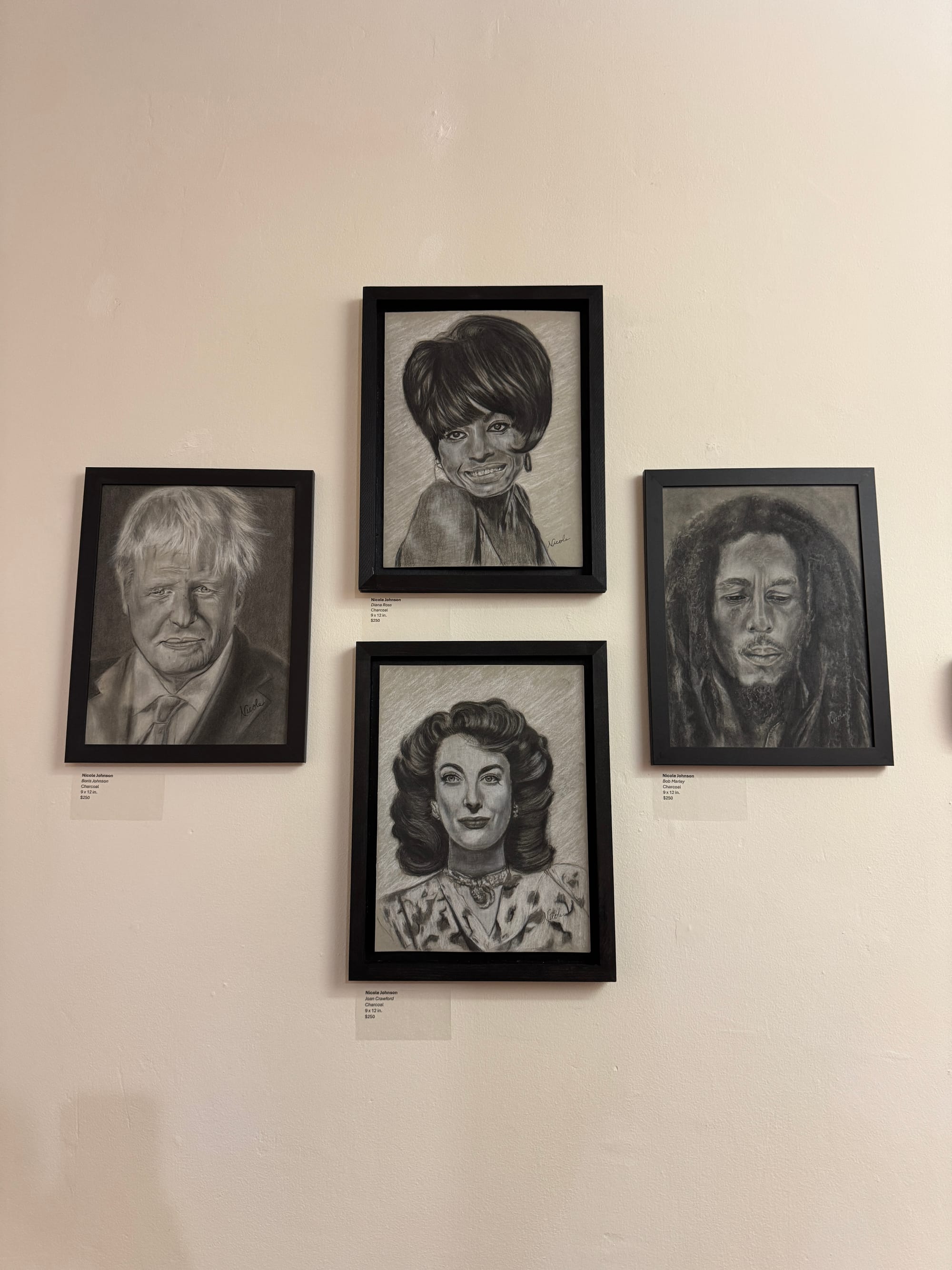 Her portraits are mostly of famous people. One set hung together were of Boris Johnson, Diana Ross, Joan Crawford, and Bob Marley. Another depicts a film still from “Harlem Nights,” a 1989 crime comedy starring Della Reese and Eddie Murphy. Portraits, especially of familiar movie stars or public figures, can be a double-edged sword when it comes to art. Everyone knows what the person is supposed to look like. It’s easy to produce pieces that invoke the uncanny valley because they’re just a little off in a way that might be inarticulable but definitely felt.