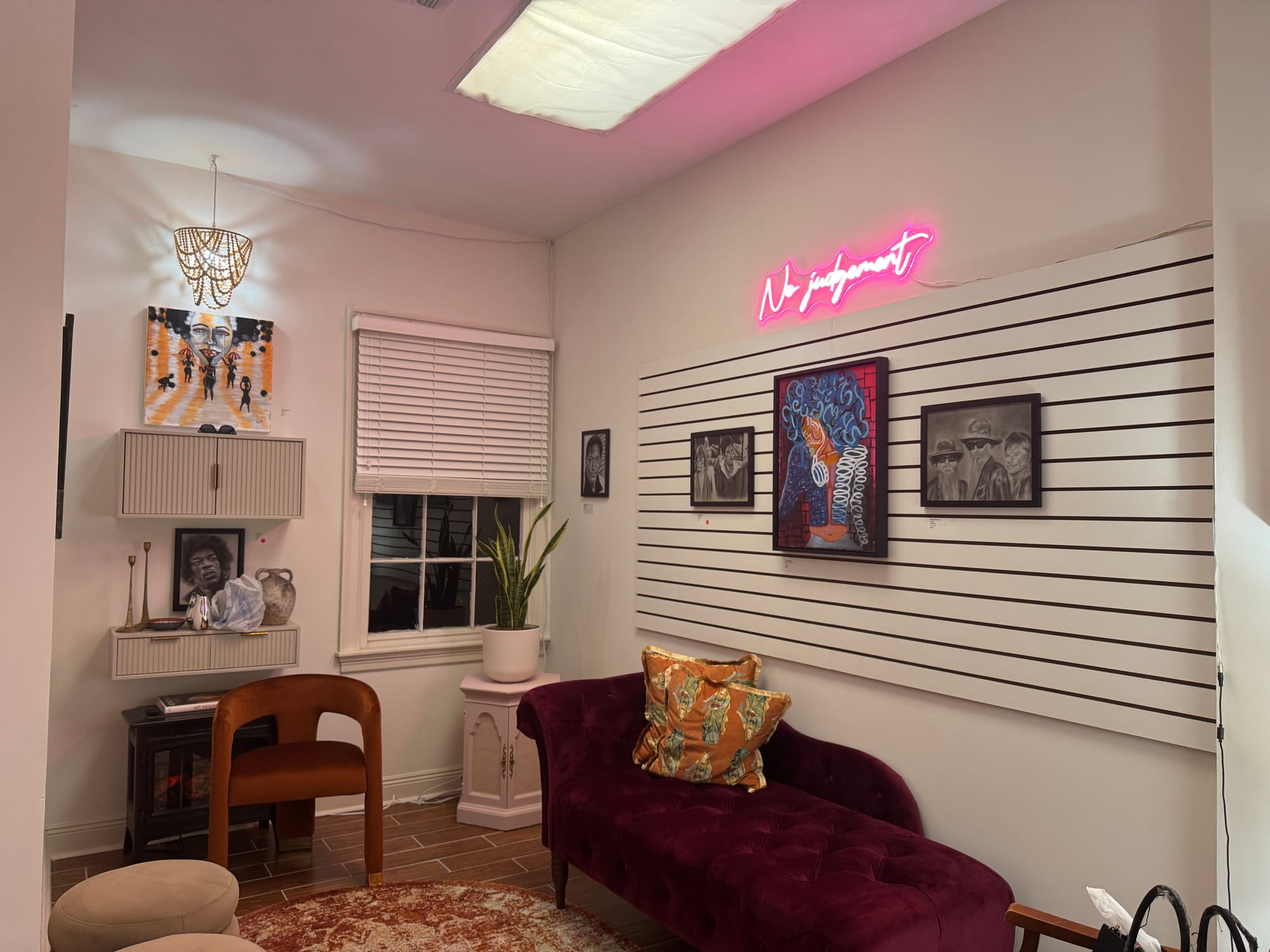 Walking up to InDemand Art Studio Saturday night felt like walking into a house party. There were people hanging out on the porch, chatting and taking selfies. The music was loud enough to set the mood but not too loud to have a conversation. The main thing that set the space apart from other studio spaces in Baton Rouge is how homey it felt. Instead of inhabiting an open space with huge walls and minimalist furniture, Johnson’s work was hung organically within a space with fun colored lounge chairs and among cabinets and wine bottles like it might be in someone’s home.