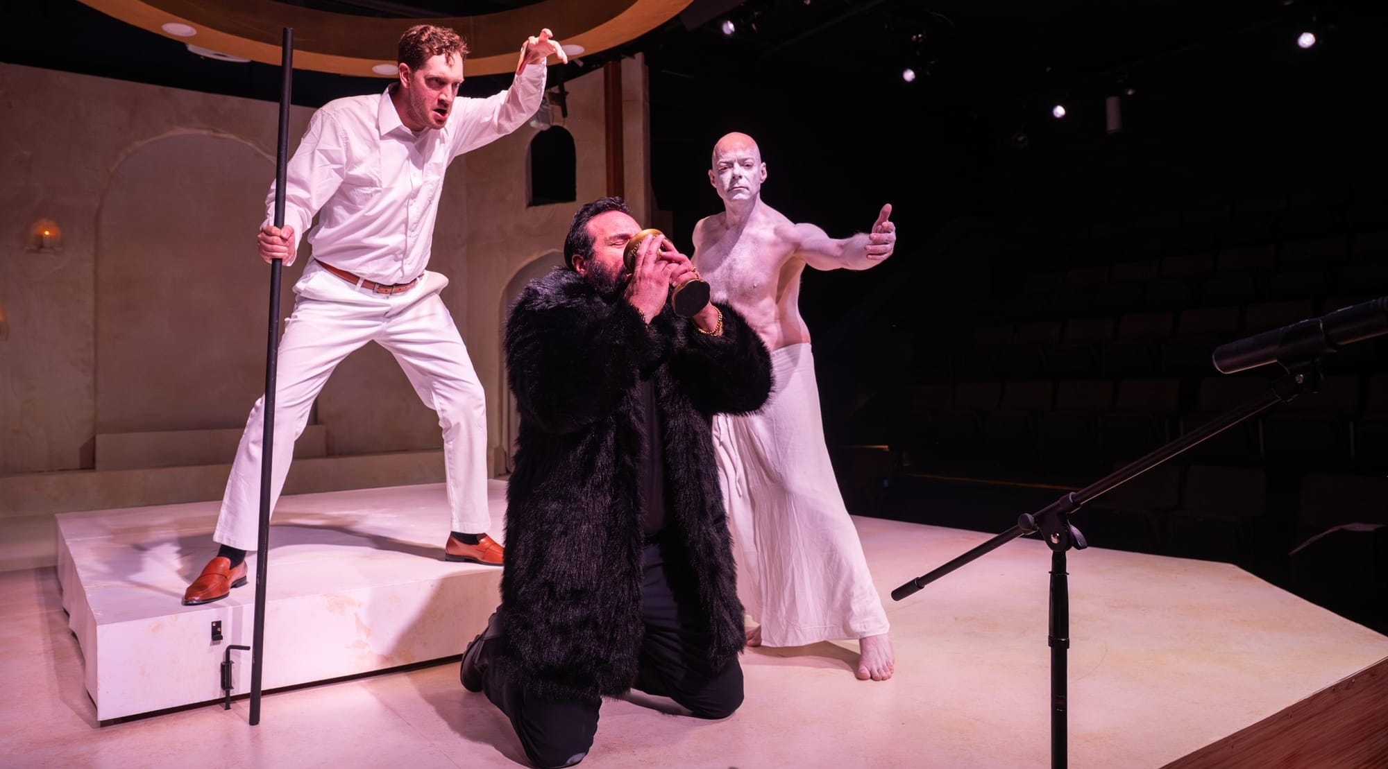 Of course, audiences share a responsibility in how a piece of live theater comes off, not unlike the responsibility they share more covertly while watching and applauding countless violent movies and tv series and then walking away from their screens to condemn bad behavior in real life. Throughout the performance there was repeated chuckling at Lisa Ramirez’s channeling of Gerturde’s drunkenness and pill-popping, stumbling across the stage or slouching, glass in hand. Do folks really still find alcoholism funny? The insincerity of Claudius, her now husband and former brother-in-law, seems sadly insincere as delivered by Dov Hassan, so that we’re never really able to assess his relationship with either Gertrude or Hamlet. Hassan and several other actors (at times including Linnard) handicap their intelligibility by shouting dialogue at a rapid rate, even though the acoustics of the Marin theater are actually quite benign for unamplified sound.