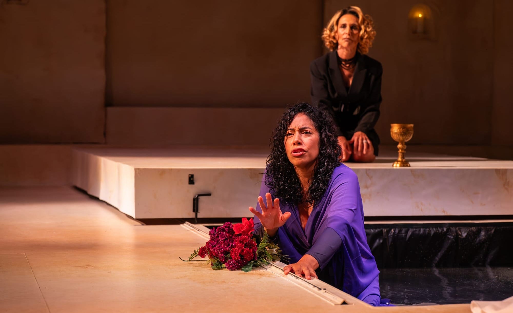 Aspects of design and staging are innovative, though it isn’t always easy to determine their intention. There are elements of Noh theater, including masks and long sticks (in place of rapier and dagger), and the Ghost of Hamlet’s father is here portrayed in a choreographed, non-speaking role, impressively, by Erik Wagner, painted white from head to foot. Partway in the production, a rectangular pool is exposed at center stage, occupied at different times by Hamlet or Ophelia. Perhaps the shallow liquid in the pool is meant to be tears.