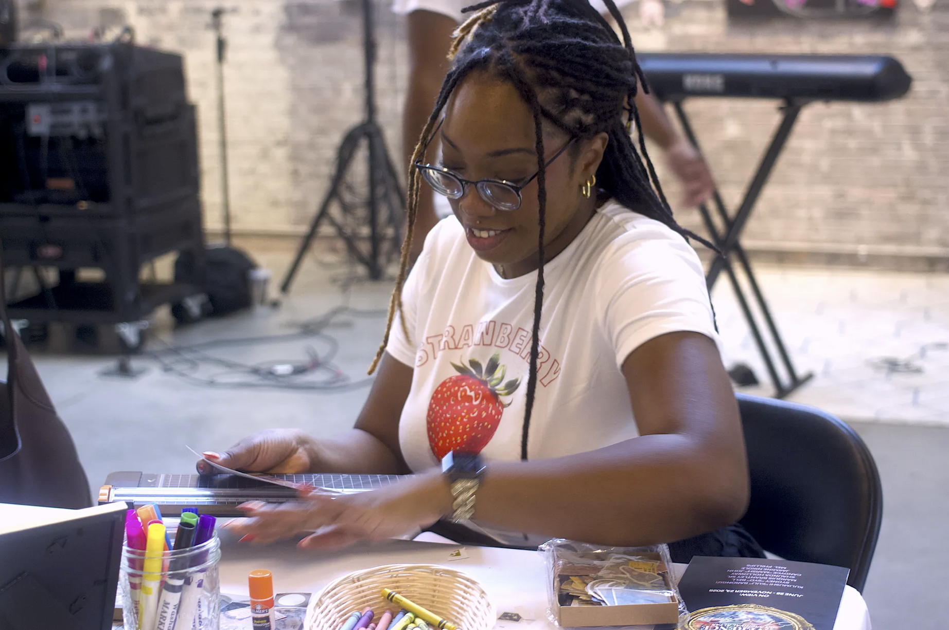 Ashley LaRue from New Haven queer art incubator Qommunity set up collage stations throughout the event space, complete with butterfly stickers, paper cutters, and two-dimensional golden frames. At small wireless photo printers along the wall , people could print pictures of themselves and their loved ones for collages or personal archives — or both.