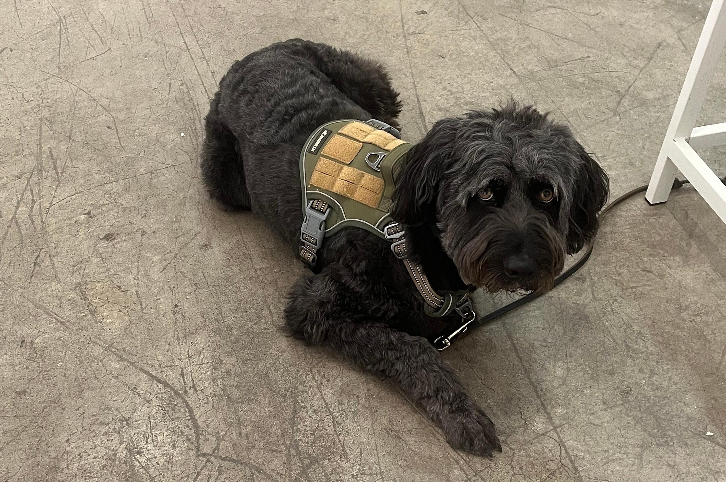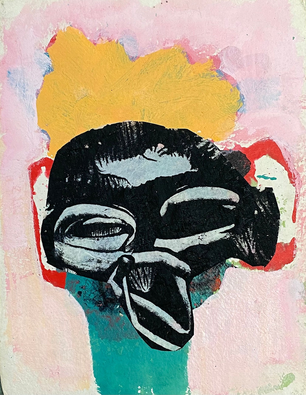 Aulik’s pieces are works on paper. During the height of the COVID pandemic, she said creatures began showing up in her abstract paintings. (“Weirdos,” as she calls them.) She took to cutting up some of her older paintings — created with oil, acrylic, spray paint, graphite, and other mediums — and assembled the parts as collages. Many of those collages and their reimagined “weirdos” are striking, particularly ones like “Crazy Al,” “Orson, Sr.,” and the one that captured me most, “Buster” (on view in top photo). He is a blocky abstract head centered in the middle of its framed space in gradated blacks, grays, and subtle touches of blue.