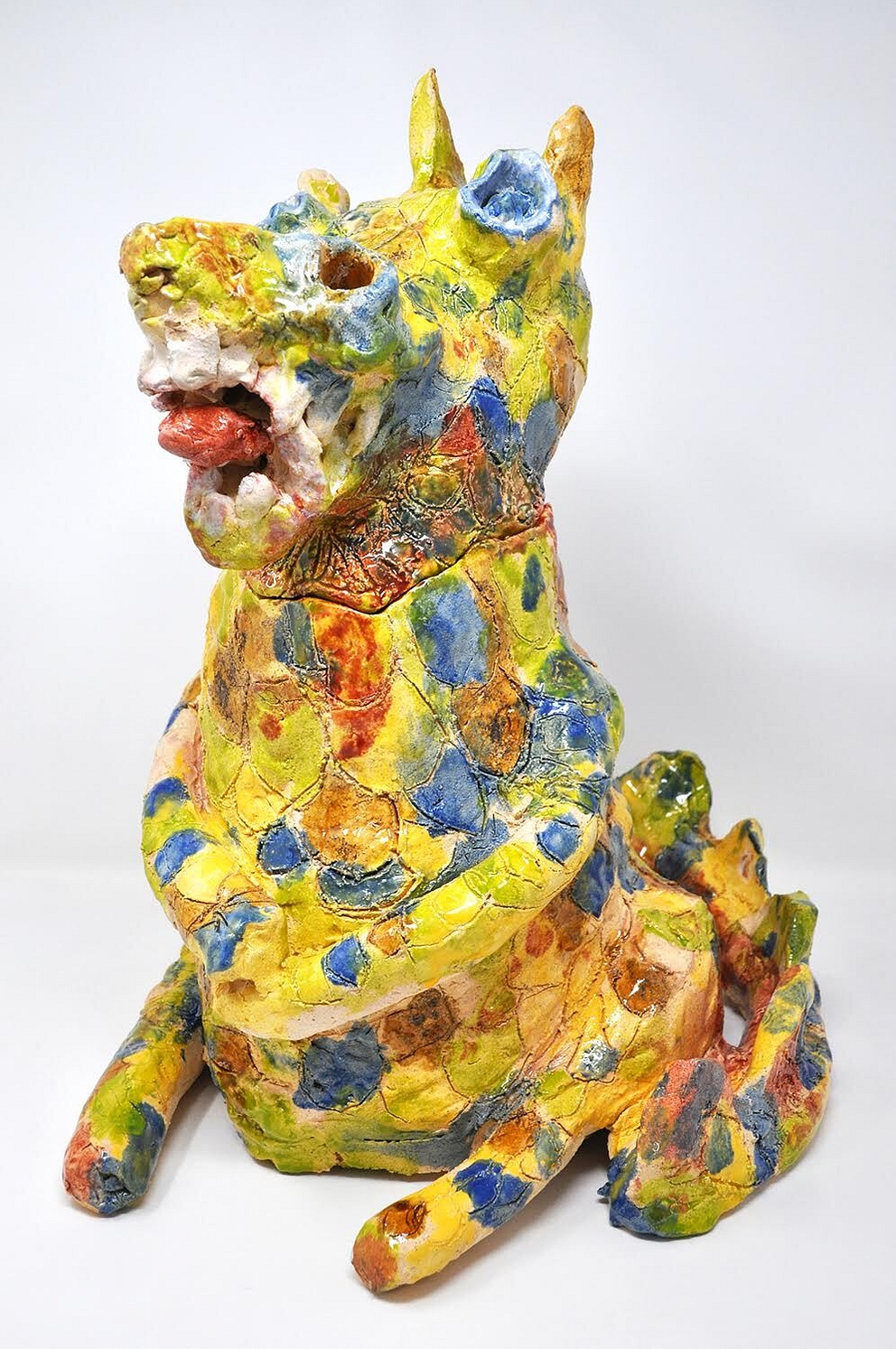 But my absolute favorites were the glazed ceramic pieces by Dorian Reid. A native of the Bay Area, Reid attends the NIAD studio regularly. Her three-dimensional pieces serve as a perfect foil for Aulik’s collages. They’re fantastic on multiple levels. The beings she brings to life include a toothy orca-like whale (“Willy the Whale,” in top photo), a splay-footed ochre-colored beaverish figure, (“Sonny”), and, best of all, “Lucky the Dragon” which has a removable head and can contain incense so that its nostrils smoke. Beauty and utility!