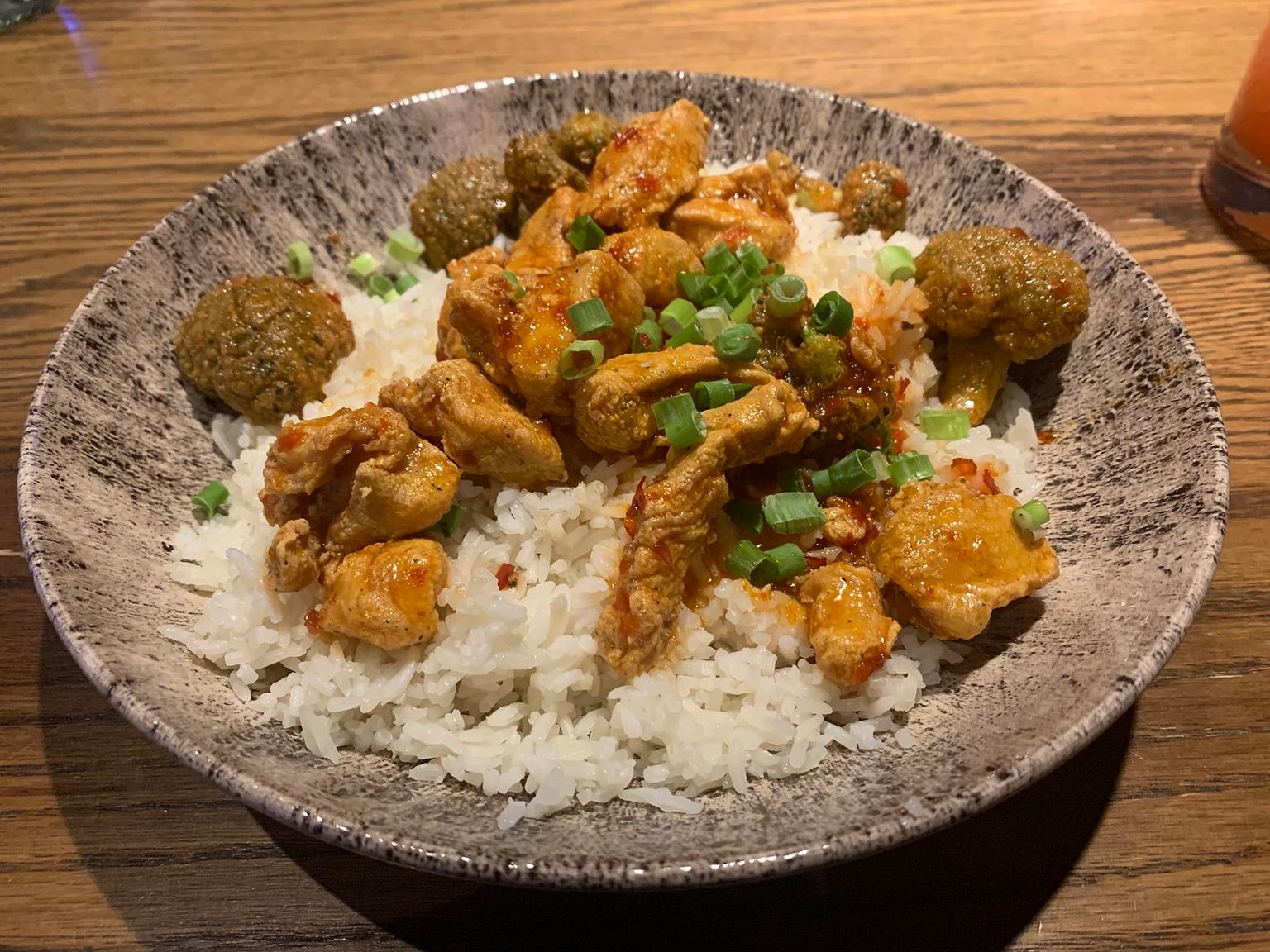 The entree that I tried was the General Tso’s chicken. It consisted of sesame fried chicken, tempura broccoli and bang bang sauce on a bed of coconut jasmine rice. The bang bang sauce was quite good, with enough spice to give the chicken a little bit of bite, but a sweet aftertaste that cooled the heat after the initial bite. I wanted more sauce to cover my rice as well, and my friend brought it over after I requested it.