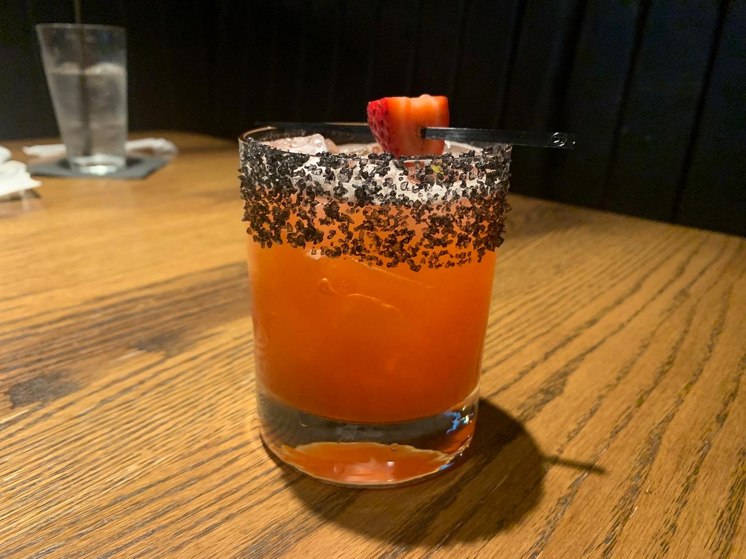 I started with the Shades of Strawberry, which was made of Ghost Tequila, Giffard Fruits de la passion, strawberry puree, elderflower, mint, and lime, and came with a black lava salt rim. Many times I recognize nouns and adjectives in food names as more marketing tools than actual descriptors. “Ghost” tequila may in fact include ghost pepper, but it’s not nearly as spicy as the name implies. In fact, I barely felt any heat at all as I drank, but I was OK with that because I was enjoying the fruity, refreshing mix of different flavors in the drink.