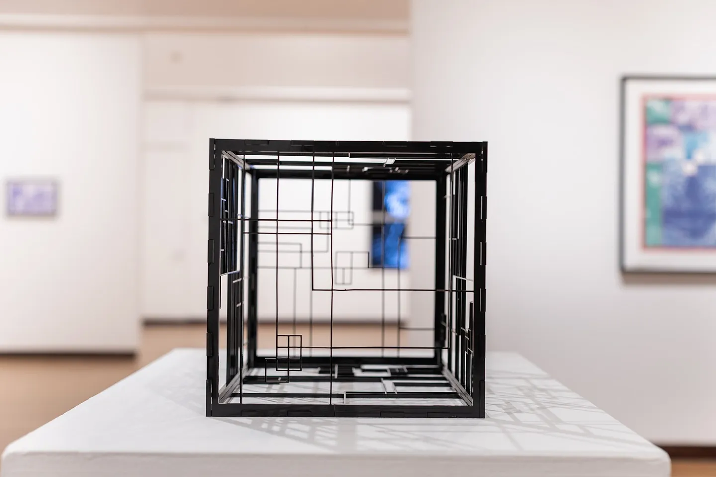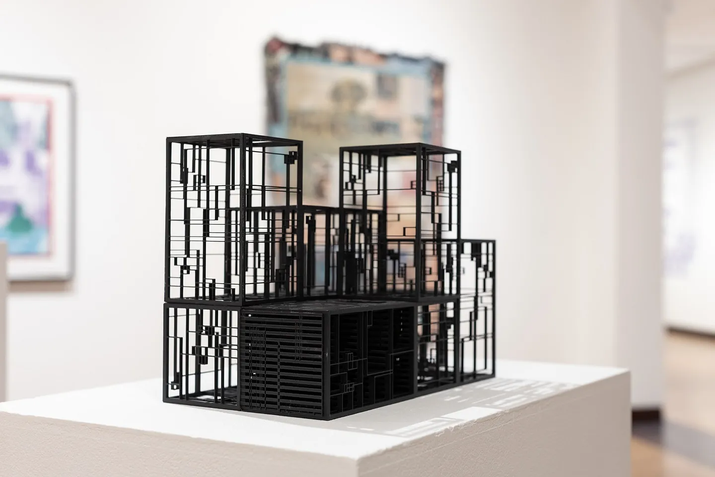 On the other hand, a series of sculptures feels completely devoid of humanity and warmth. These structures, positioned centrally in the exhibition, are much more evocative of what one typically thinks of when it comes to grids: hard, black and unyielding, like the lines on mathematical graph paper or the unchanging layout of a street design.