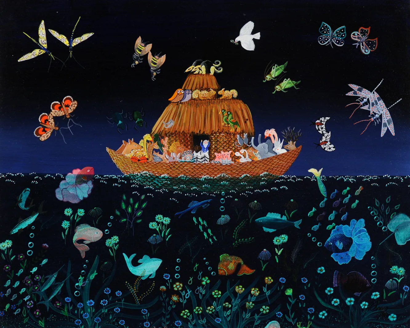 Speaking of the universe, it may not encompass all of existence, but Untitled (Noah’s Ark) by Amui is an interesting compliment to the themes elsewhere in the Echoes and Collisions exhibit. First of all, the man in the painting, presumably Noah, is not Black. Given the overall pro-Black tone of this review, it might surprise you to learn that I’m not really into the whole “X figure in the Bible was actually Black,” because 1) who cares? and 2) the Bible does not take place in a majority Black part of the world.