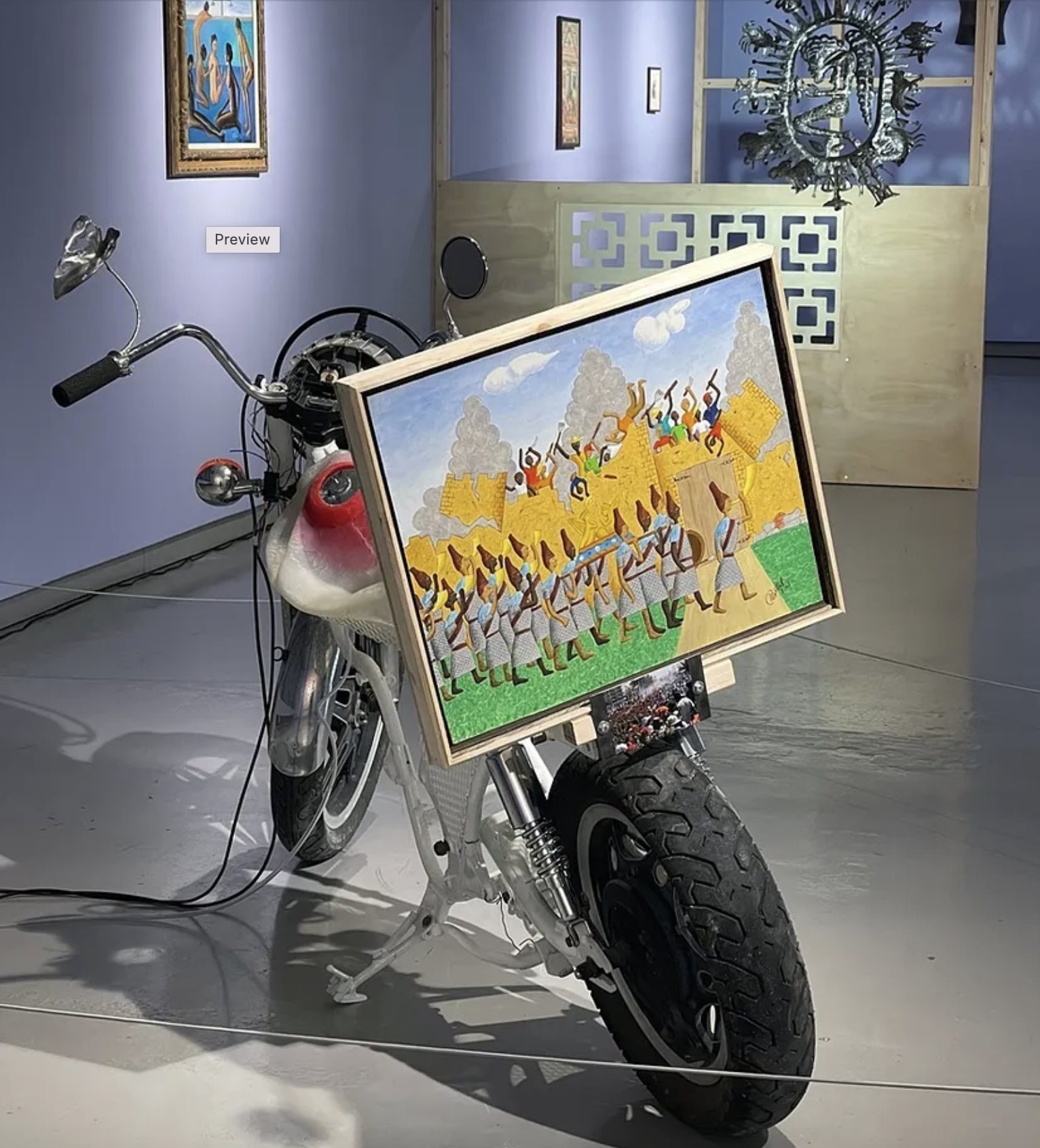That tradition of bravery continues through to today, and is represented in the choice to rest Bottex’s painting on Henry’s piece, Resurrection Highway. The “moto,” as it’s called in Haiti, is one of the key modes of transportation in the modern country. Since the revolution, Haiti has been forced to endure devastating earthquakes, political instability, crippling debt payments and the on-again, off-again interference of the United States under the Monroe Doctrine. Yet still its people drive forward, one resurrection after another.