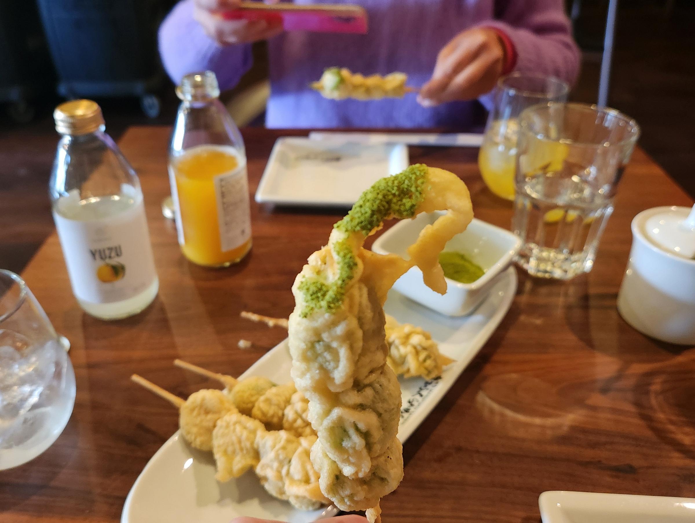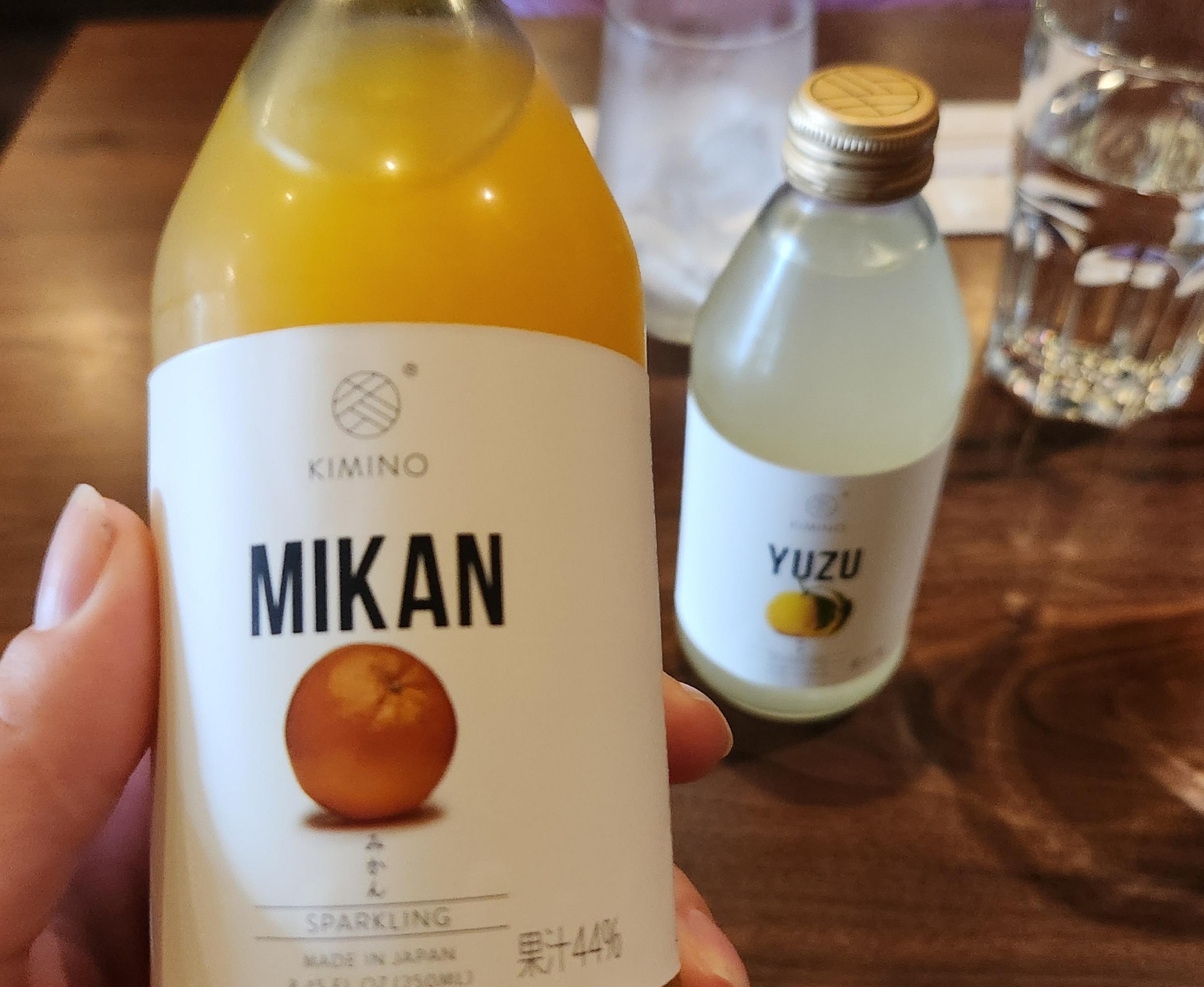 We’d also ordered two flavors of bottled soda, a mandarin and a yuzu, as well as tempura-fried Brussels sprouts to share. The drinks were lightly effervescent with a good sugar level — just sweet enough for good flavor and a lovely offset to the meal, not so sweet as to eviscerate the taste buds or leave an aftertaste. I found the mandarin flatter with almost an overripe flavor, though not bad, but loved the yuzu — bright, floral, and with much more of a tart edge. We both found them to be like elevated versions of a San Pellegrino limonata and, for lower-brow and older school tastes, an Orangina, but fresher and more fun.