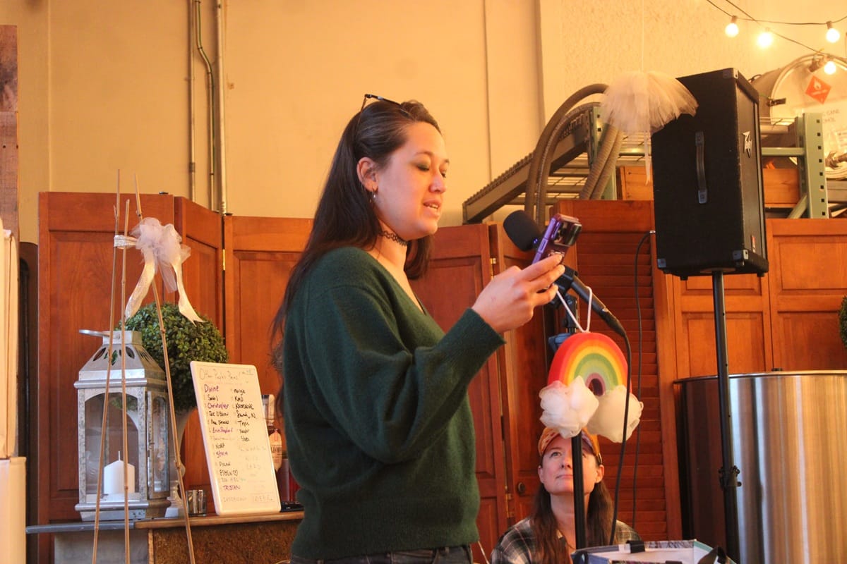 One of the readers, Sarah Johnson, spoke about her personal life. She’s undergoing a full hysterectomy very soon, and shared a poem dedicated to the procedure. She read “poem to my uterus” by Lucile Clifton. She uses the comparison of the uterus to a sock to deliver a devastating closing to the poem: