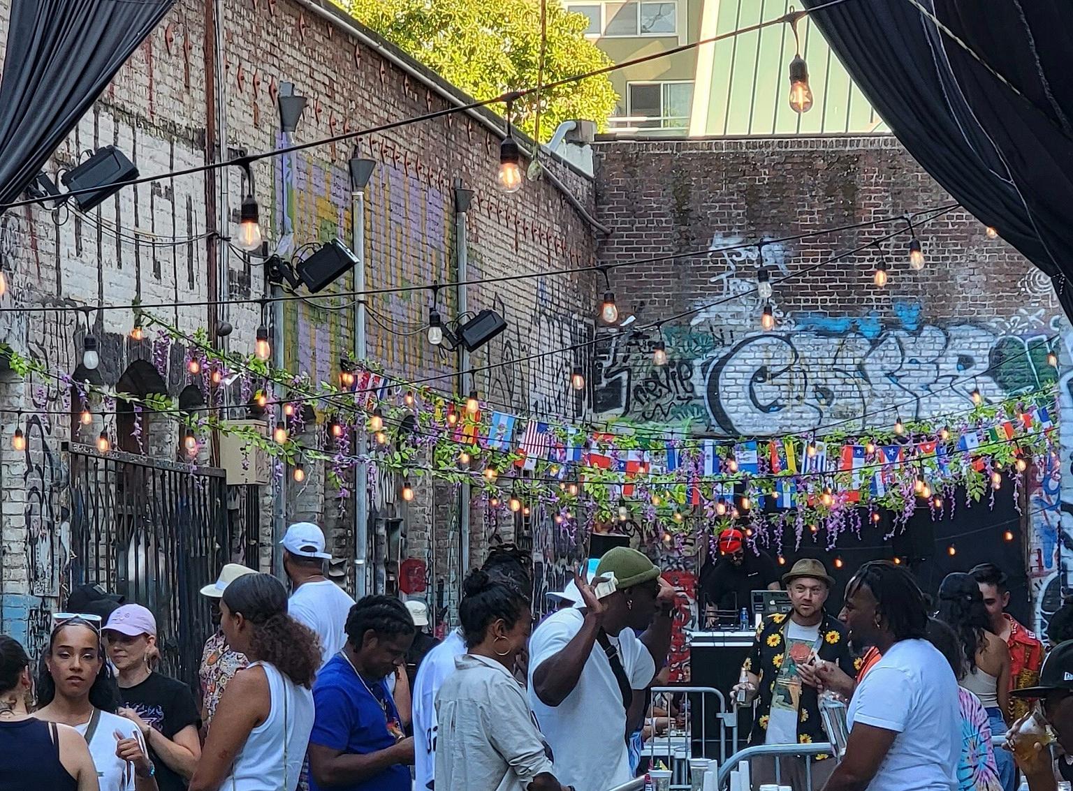 This past Saturday’s edition of the party was its first daytime incarnation (doors opened at 3 p.m.) and was produced in partnership with a burgeoning local cannabis company called Kounter Kulture. Set in the long narrow alley behind Oakland’s Level 13 nightclub, the venue was framed by brick exteriors adorned with murals, tags, and handstyles. The weed, the soundtrack, the setting, and the time of day all contributed to turning what was once a raucous and spry affair into something significantly more subdued. The vibe was more akin to a family reunion than a sweaty and lustful night at the club.