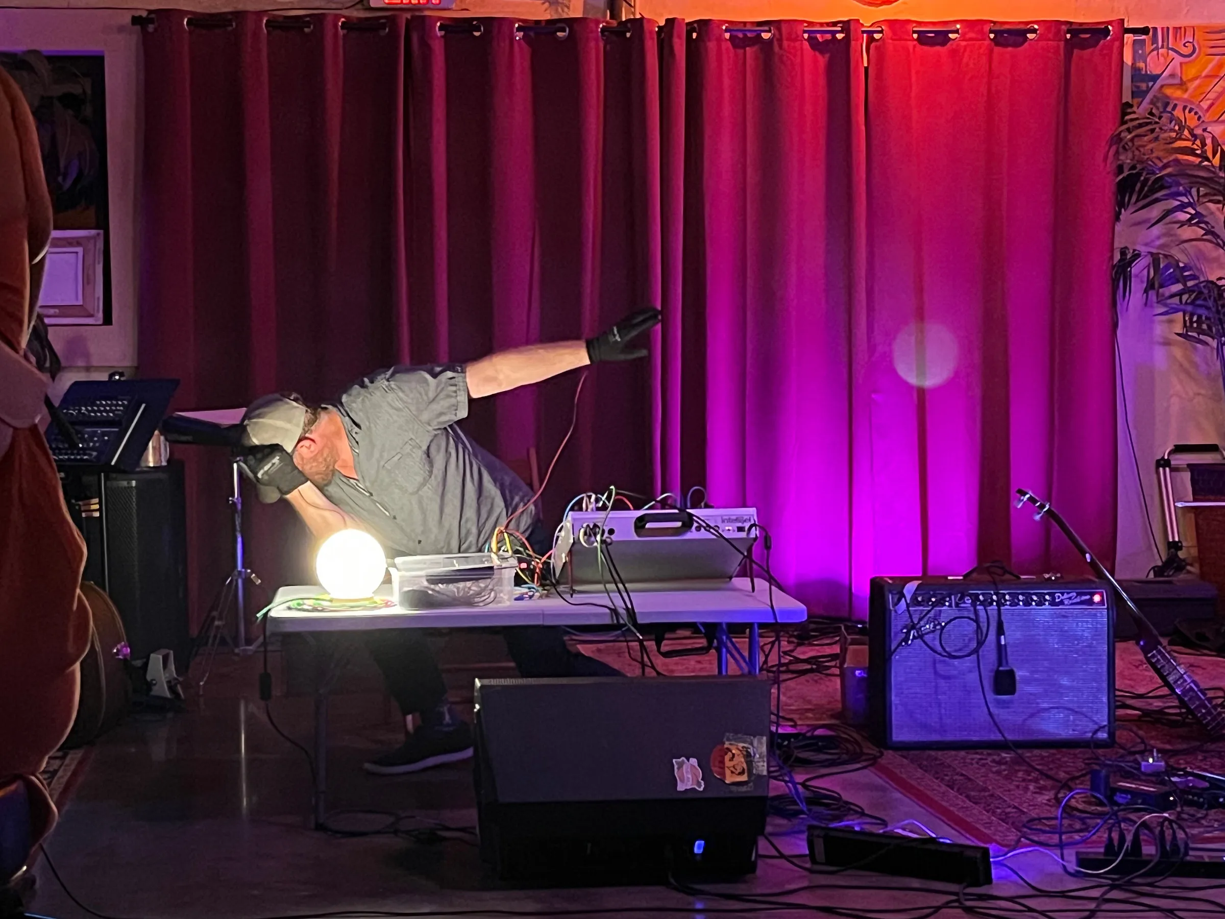 Broome (a member of the New York-based Ensemble Pamplemousse) followed with an iteration of his current experiments in linking sound with light. Sitting at a table next to a modular synth and a little lamp, wearing dark glasses and dark gloves, he sipped a drink, meandered around, covered and uncovered his face with his hands, reached across and hung out for a while, leaned way back in his chair with his eyes to the ceiling — and every time he shifted, the sound changed. Turns out the glasses and gloves are studded with invisible oscillators that pick up light from the lamp, translating the waves into sound: more light = more sonic intensity. (Full disclosure: I’ve played with this tech, and it’s a trip.) The performance was mesmerizing as the audience gradually caught on to the fact that the noises from the speakers were being modulated by his movement toward or away from the light source. Channeling music — through movement — through, like, photons? This is literally Einstein territory, disorienting and bewitching, and the ease of Broome’s casual action only heightened the surprise. After Broome’s set, Tomshany said to me, “I started to think I might make a noise if I looked down.”