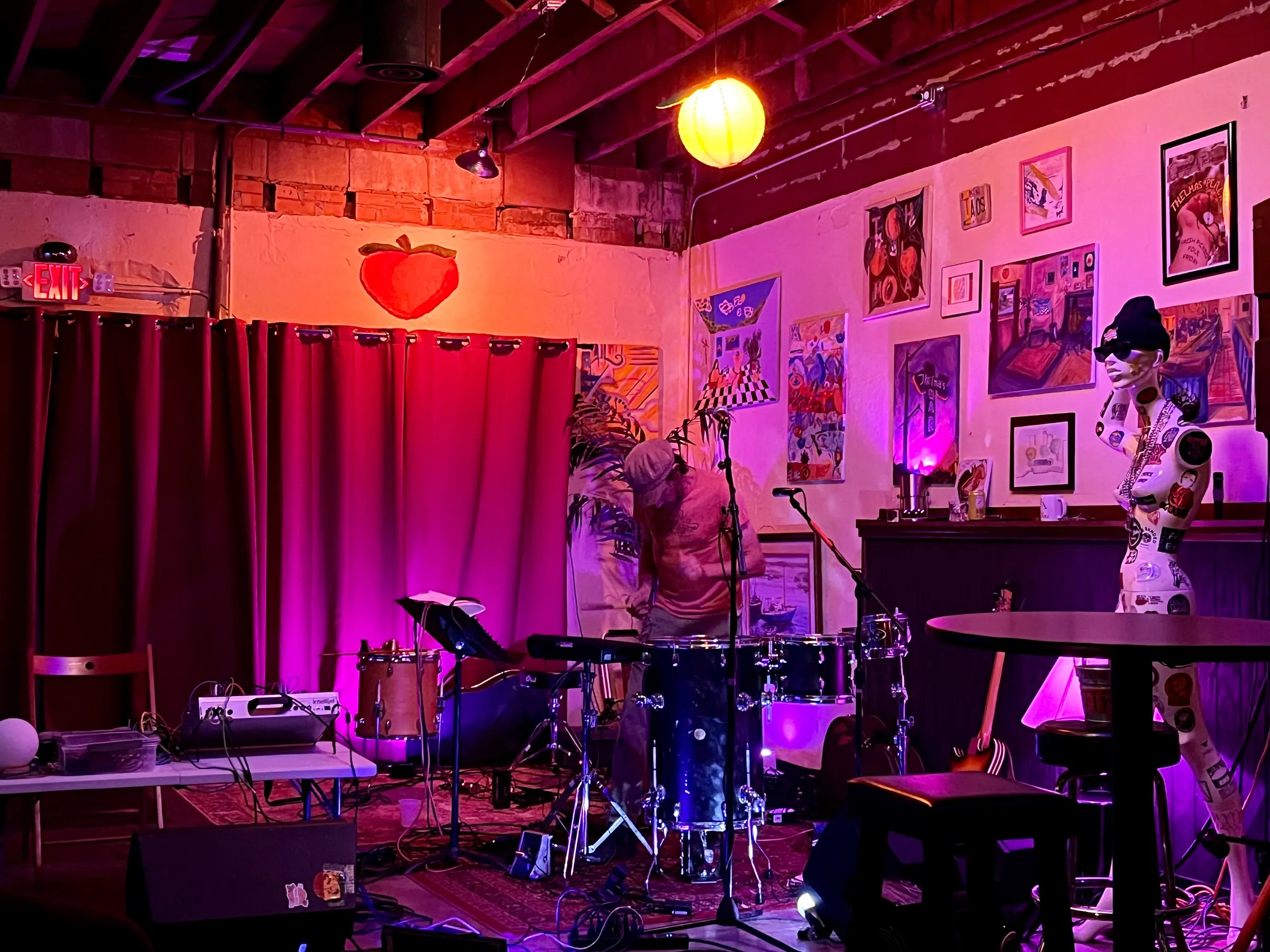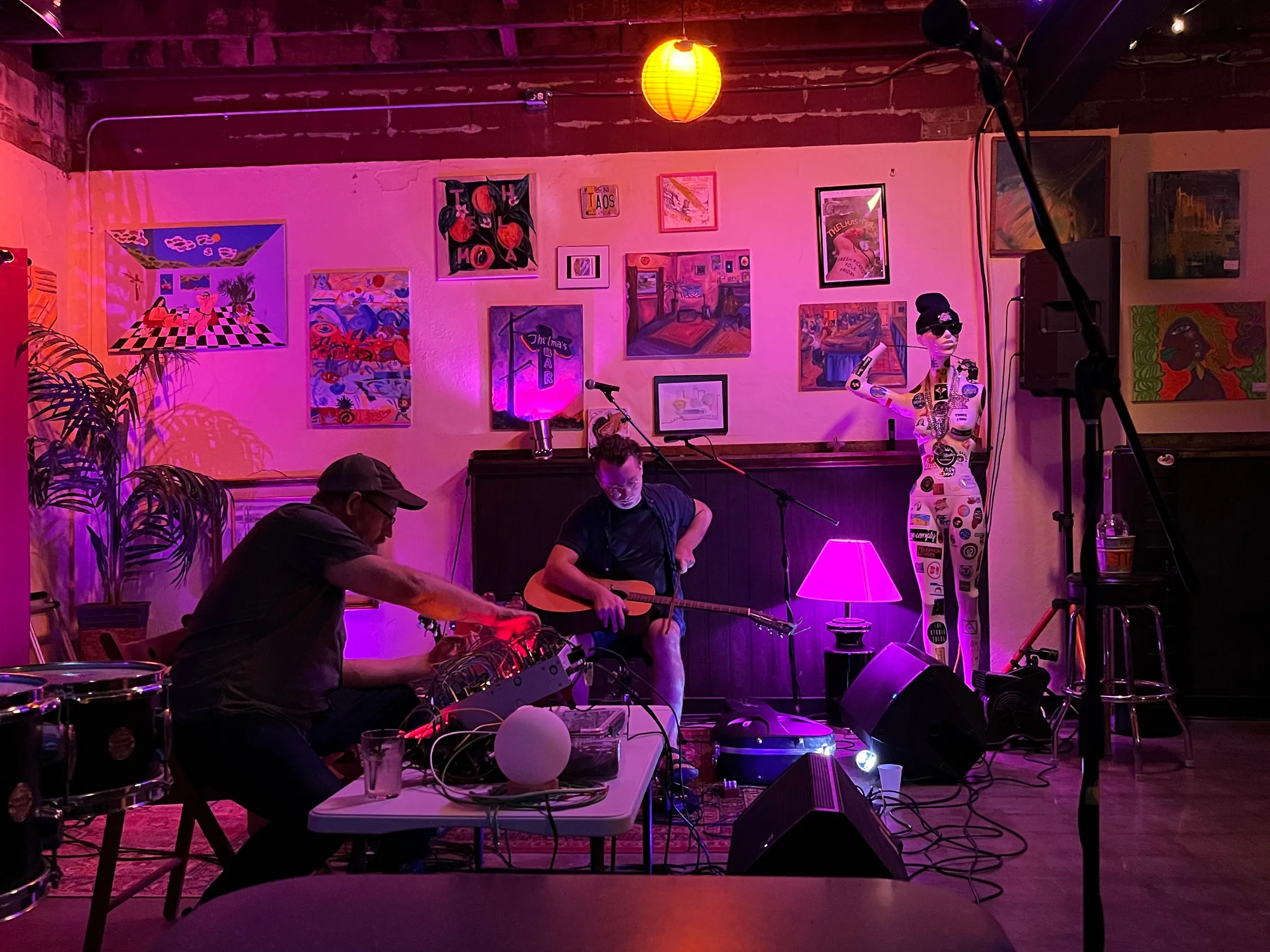 Thelma’s Peach—a tiny venue in a vintage dive bar at the western edge of the Kendall Whittier neighborhood, where stray cats roam the nighttime streets — has become a welcoming home for this kind of exploration. (The proprietors hosted concerts in a backyard prior to taking over the bar space.) One recent night, three of Tulsa’s resident mad-scientist sonic geniuses set up in a wash of orange and purple lights for several hours of playtime in the wild spaces of sound.