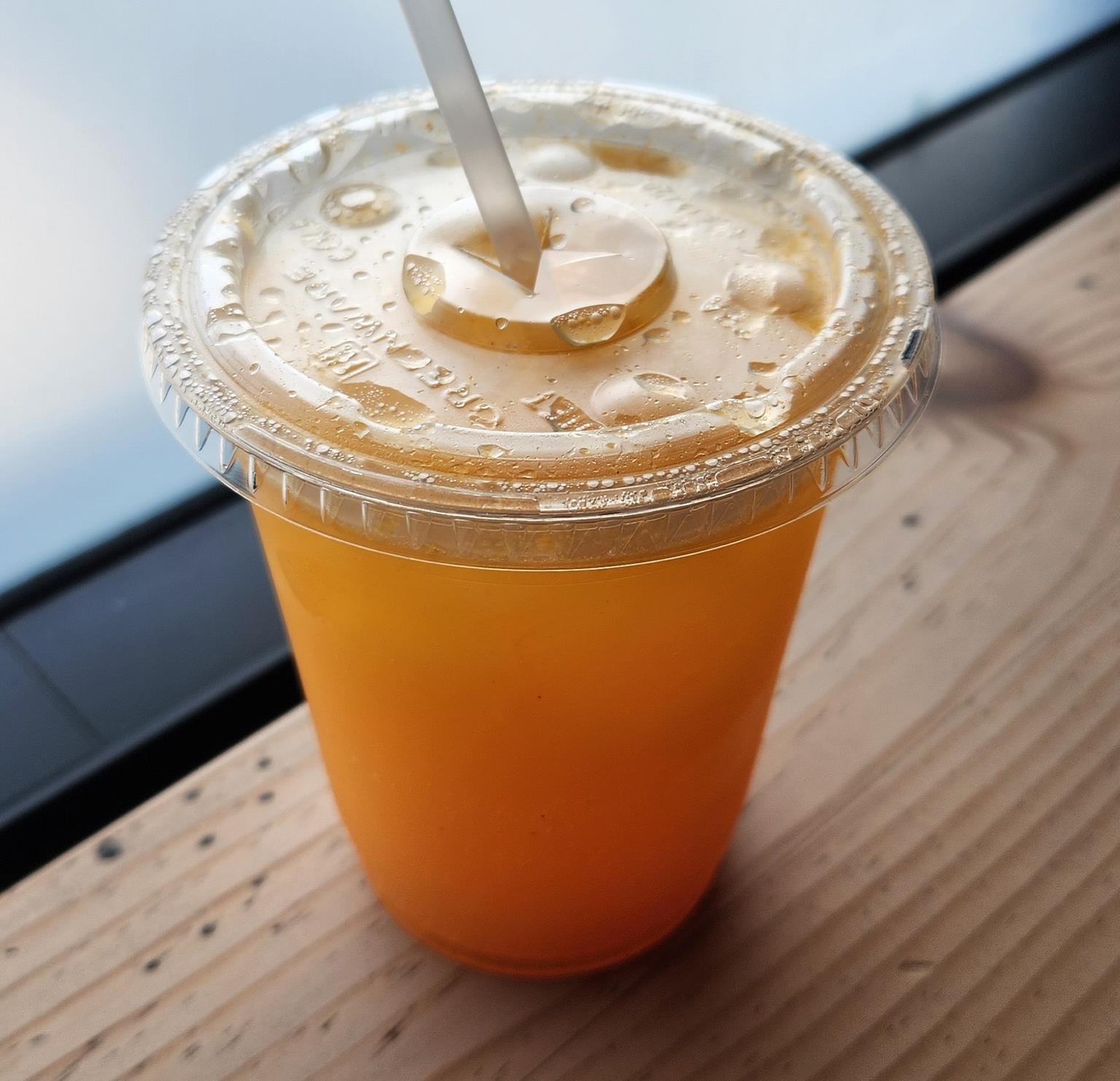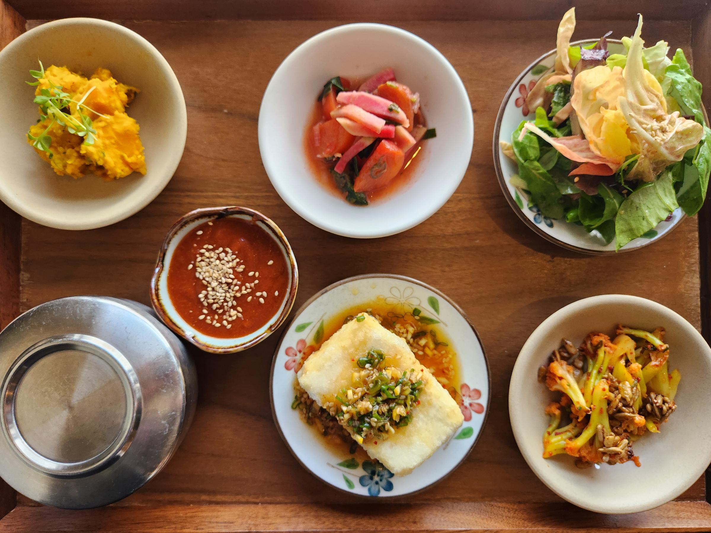 Boasting a small menu, the space was slow for lunchtime when my friend and I arrived, so we got to soak in the cute finishings, smattering on happy and healthy real live plants, and adorable merch before ordering. We selected the fried dooboo set with hot date sauce added ($20 + $4), the vegan banchan set ($13), and a persimmon spritz ($7) to split.
