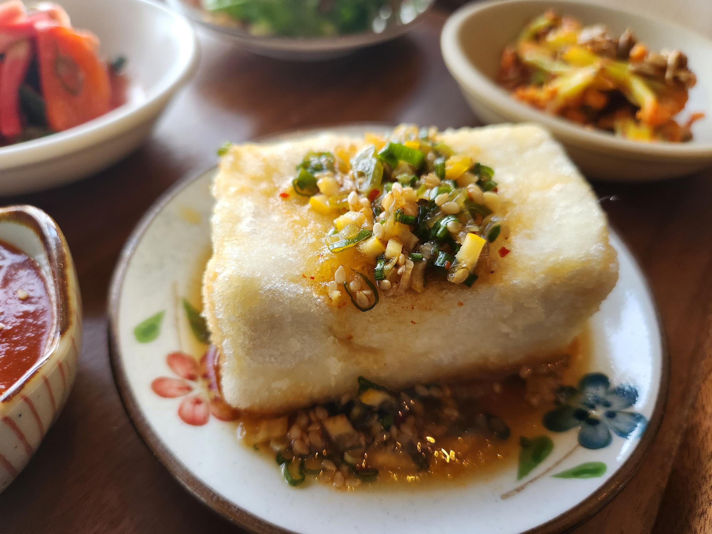 The restaurant takes its name from the dooboo, or Korean tofu, and the chef/owner, Steve Joo. The dooboo set came as a set of six small dishes — a smashed kabocha squash, salad, pickled radish and persimmon, cooked cauliflower with sunflower seeds, rice, and, of course, the dooboo. The banchan set had the same pickled veg and squash along with an anchovy dish Jasmine loved and a different, pickled cauliflower with carrots.