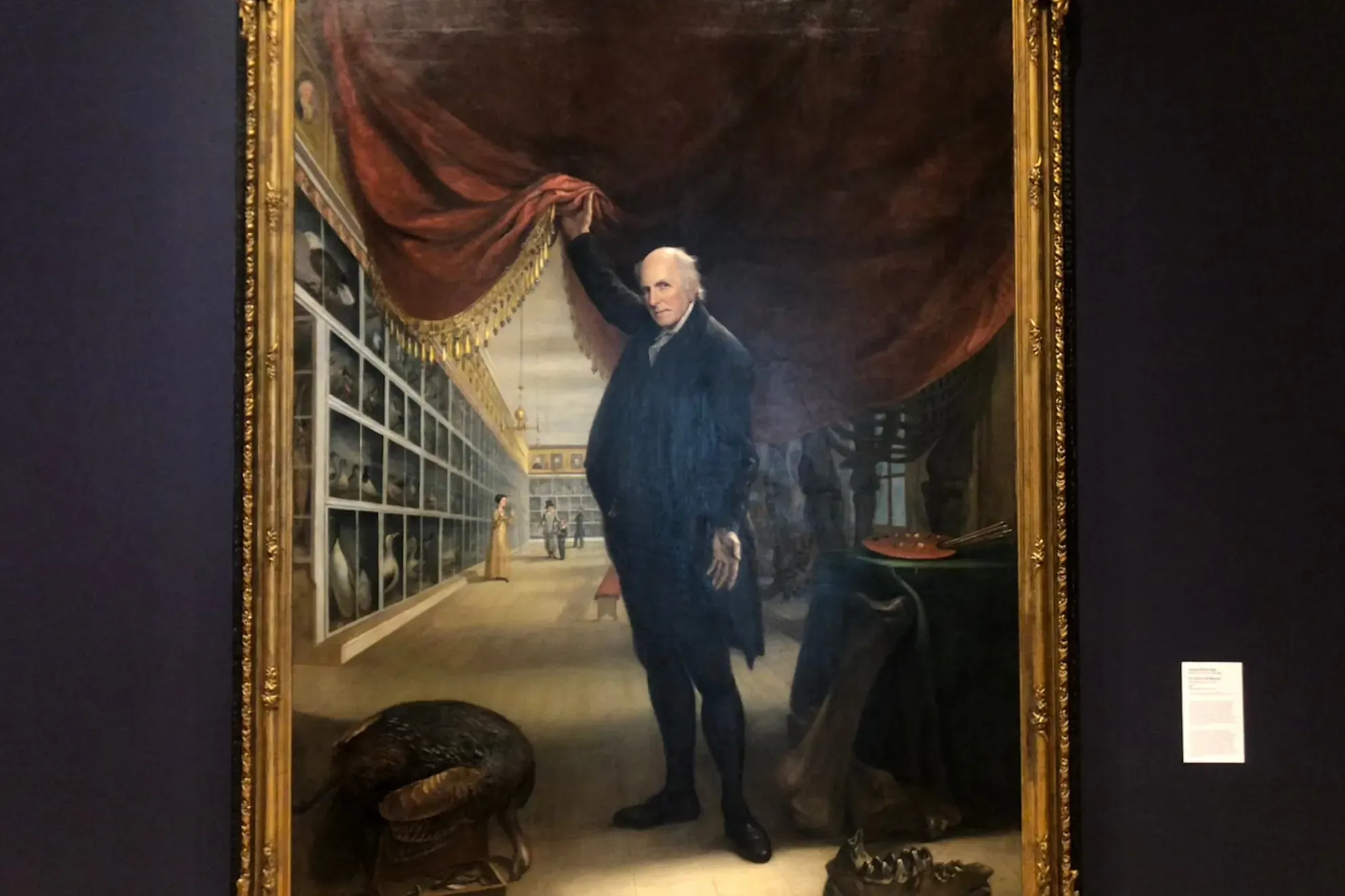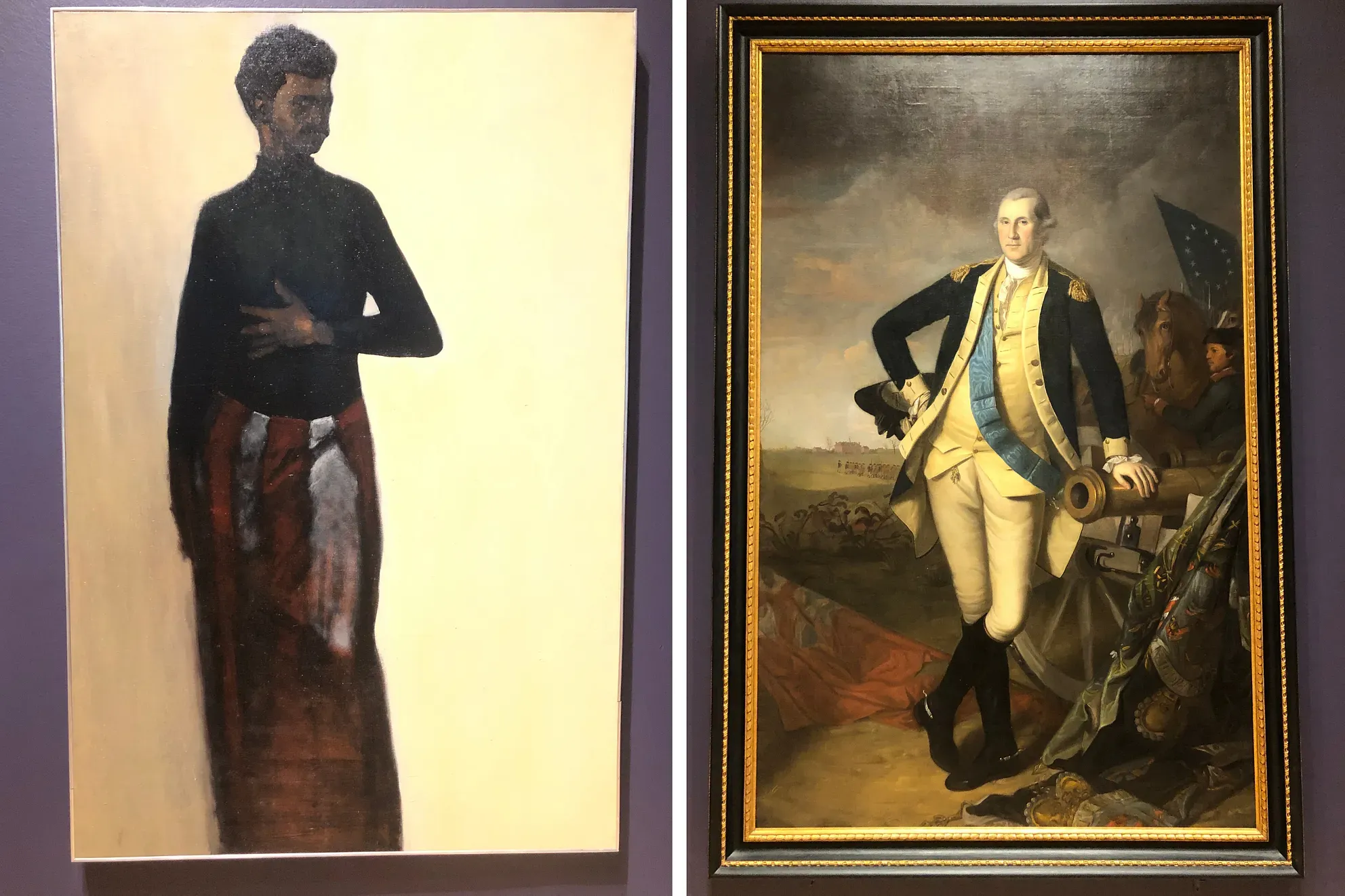 One of the more visceral moments comes from a side-by-side pair of portraits: Peale’s portrait of George Washington next to James Brantley’s (b. 1945) Brother James, a sober self-portrait that drapes the Black artist and veteran of Vietnam in the colors of a subdued American flag. In Peale’s portrait of Washington there features, at the president’s side, one of his purchased slaves.