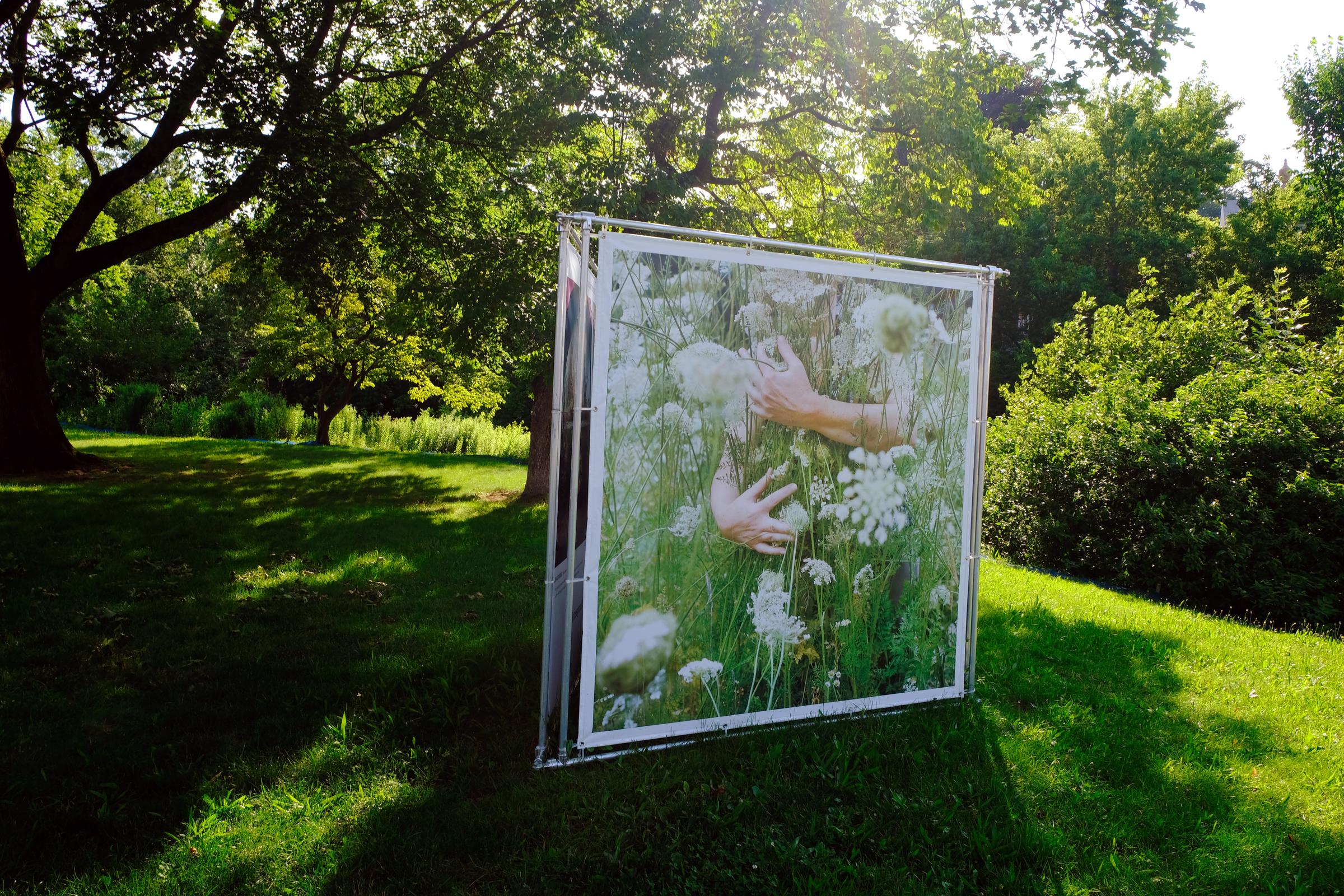 The Winchester exhibition, which runs through Sept. 9, features art printed on 10’ by 10’ cubes, and feels too large to be contained by walls. As many of the cubes are focused on the environment and climate change, it felt especially fitting to be experiencing them outside, next to a lake and surrounded by the sounds of birds, church bells, and the occasional Amtrak or T train.