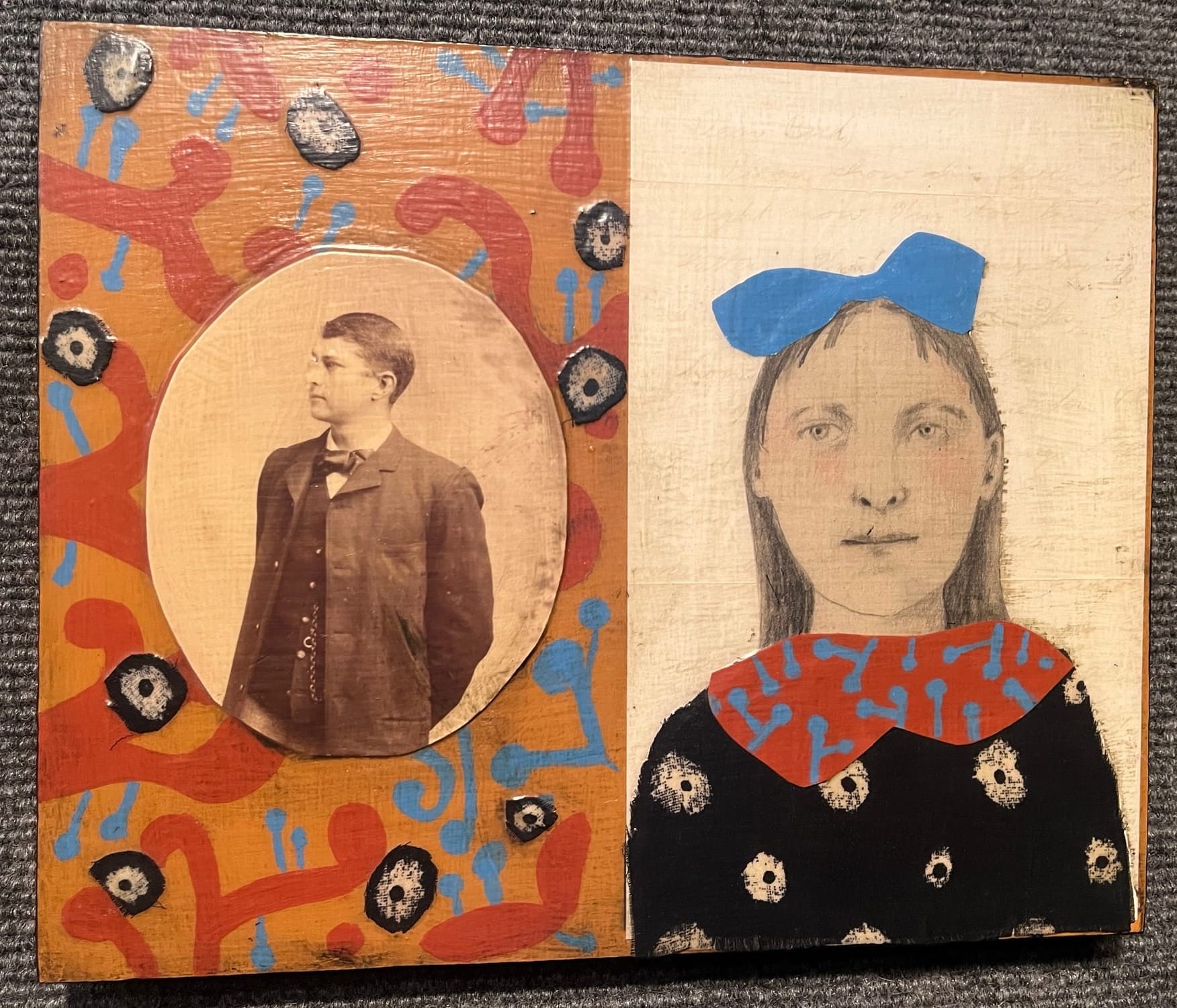 As it turned out, Joseph Cornell is one of Balian’s influences. She’s self-taught, now retired from almost four decades as a nurse practitioner, creating in her backyard studio. She described to me the elements of “Dear Bud,” a collage/painting that includes a found love letter written in pencil. After she’d applied faux encaustic to it, the graphite writing of the letter faded almost completely away, something she seemed a bit bummed out about. She also showed me a piece entitled “The Usefulness of a Clean White Shirt” that she claimed she “didn’t like,” hanging low on its room divider, which I found a bit odd as she had still chosen to display it.