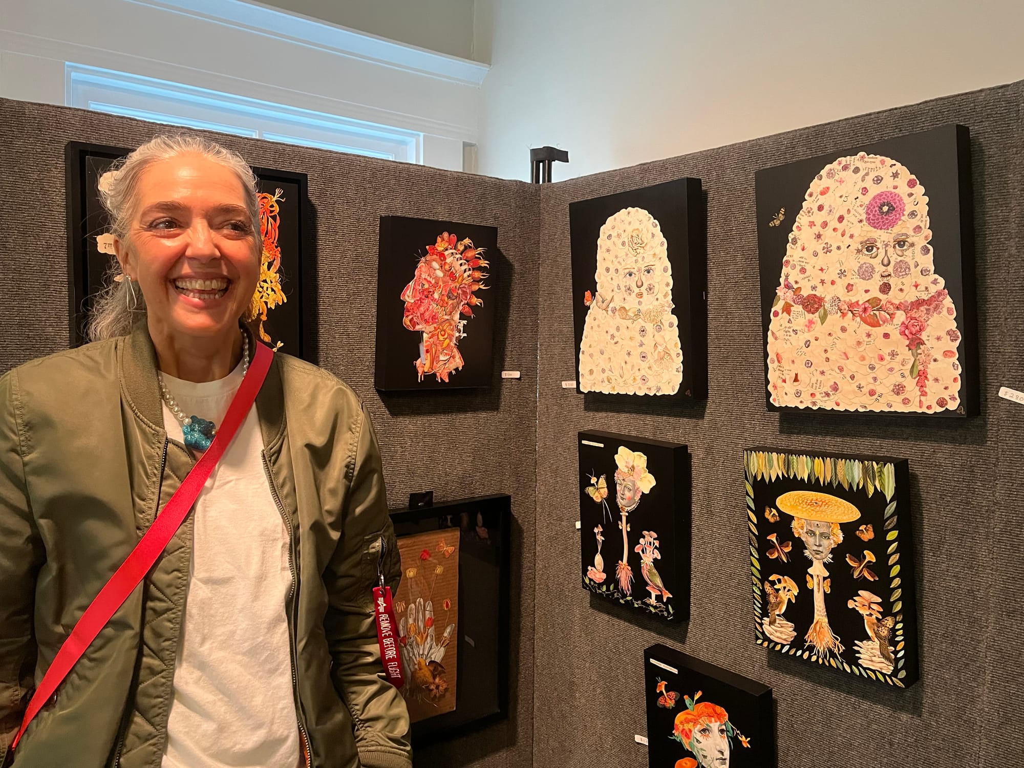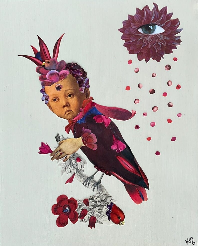 “I’m a lapsed Catholic,” McCann said. Soft-spoken, almost shy, she told me that she was born and raised in London, moving to the U.S. in 2000. Many of her collages are named for saints she’s fascinated by. My favorite of these was “Saint Gertrude”: a somber-looking child’s head on a bird’s body, crowned with a flower and a tiny parrot’s head, an eye within a blossom seeming to cry petal tears looking over it, all in subtle shades of purples, pinks, fuchsia, and red. I loved its faintly spooky quality.