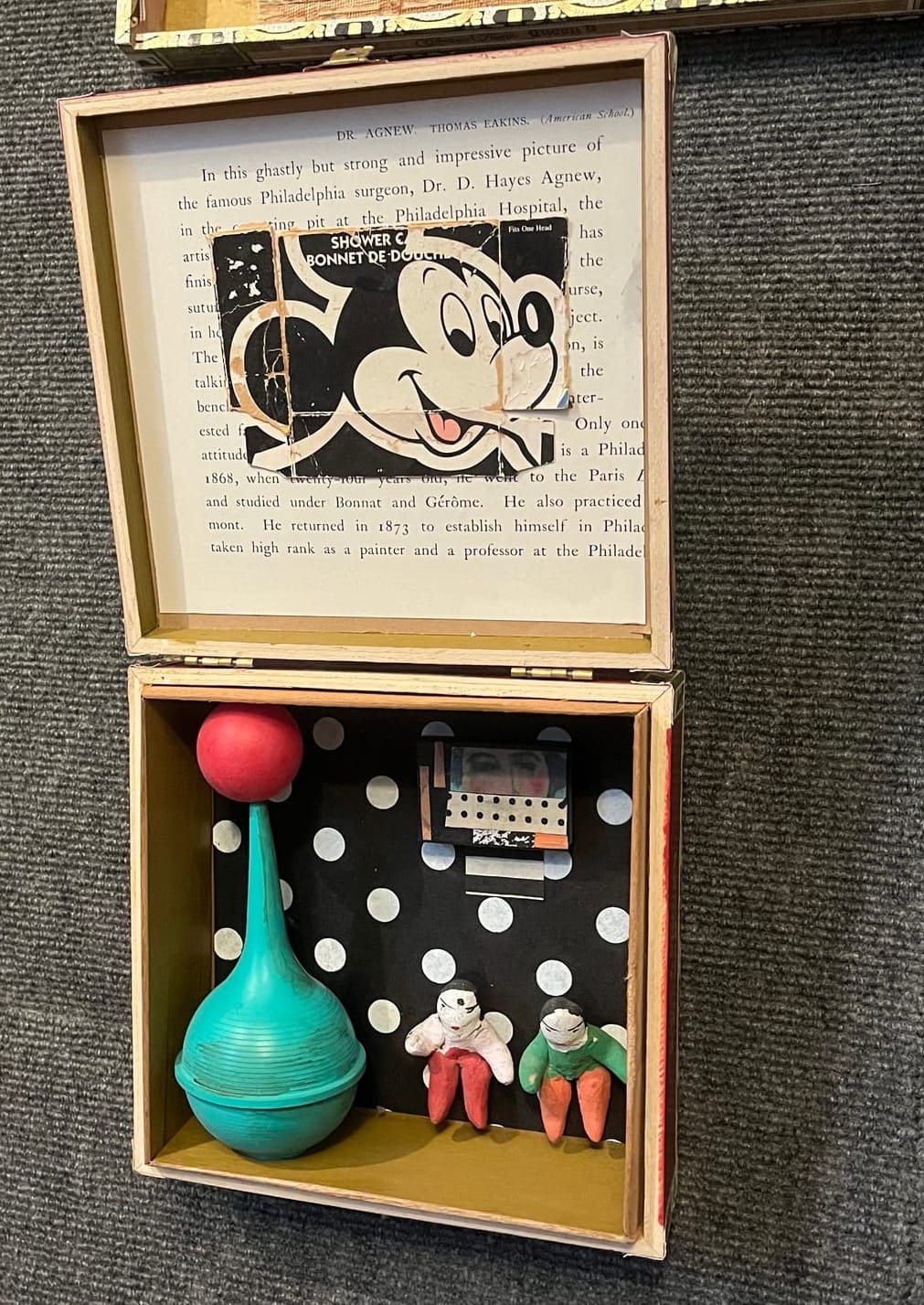 Balian’s work complemented McCann’s, with her found objects for her pieces. Most of her work is on wood panels using paint, faux encaustic, and found objects like photographs, playing cards, and product wrappers. I was taken with “Mickey,” which reminded me of Joseph Cornell’s box assemblages. Balian’s cigar box piece contained a couple of clay figurines, a plastic bulb syringe with a little ball atop it, and a tiny collage she made on a matchbox. Above these trinkets on the open lid is an image of Mickey Mouse on a flattened shower cap box—boxes and boxes within boxes.