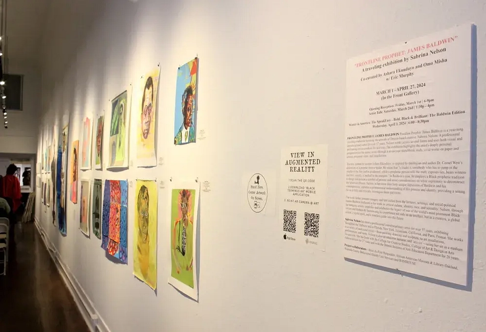 The traveling exhibition, “Frontline Prophet: James Baldwin,” features works from Detroit artist Sabrina Nelson. Pop art-style portraits of Baldwin covered the walls, infused with hues of bright red, cobalt blue, greens, and golds. Seeing Baldwin’s face in modern styles brought him out of the past and into the now in a refreshing way.
