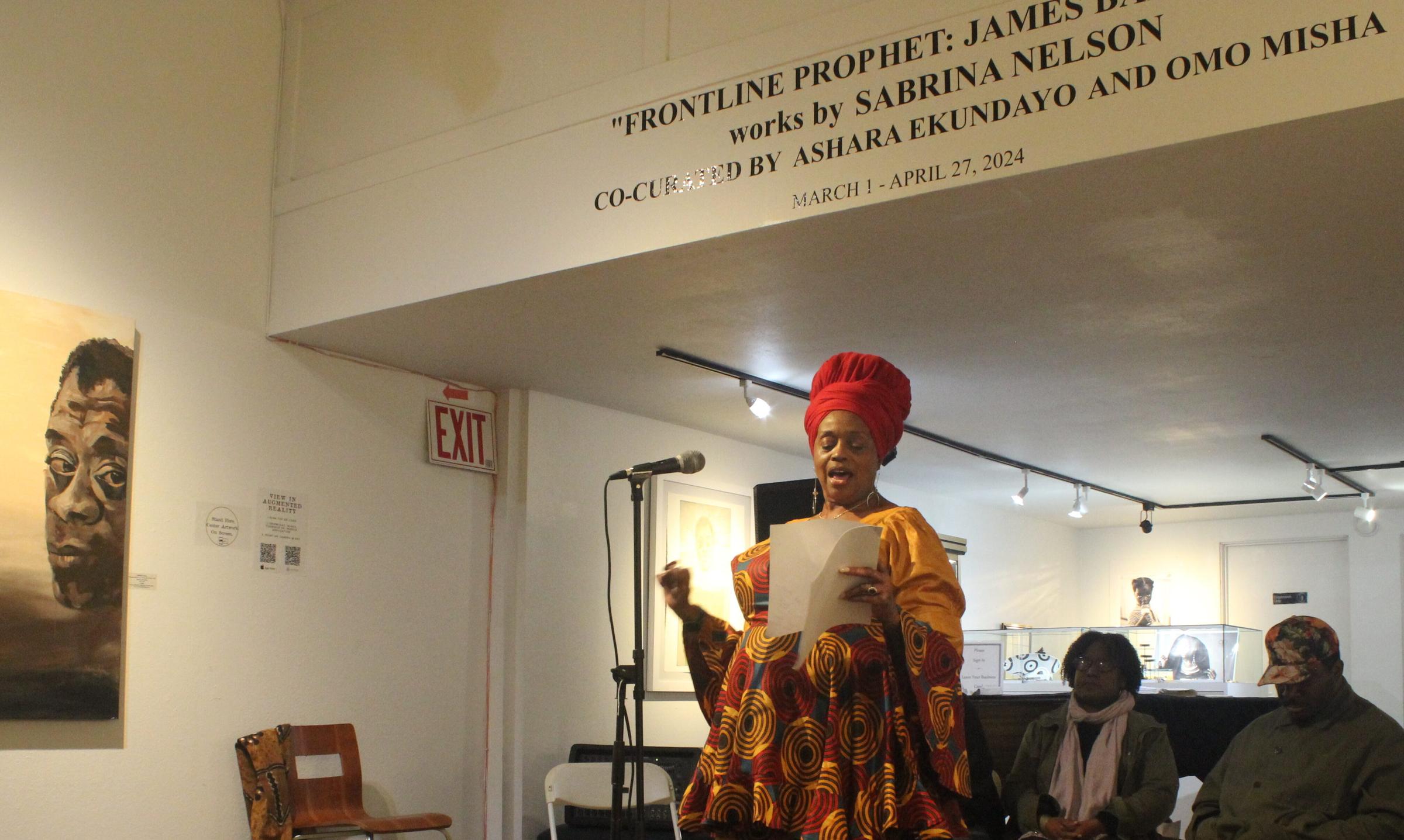 Nelson told us a friend had asked her to come along on a trip to Paris. The friend was giving a talk and wanted her to paint during the talk. About the trip, she said, “I felt James Baldwin’s spirit touch me there. Twice.” In a perfect summary of the evening’s exhibition she stated, “I feel like he picked me. There. That’s how this happened.”