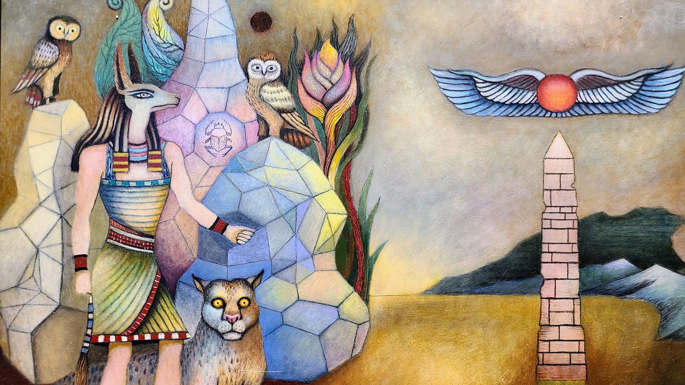 Seltzer’s paintings interpret ancient figures and symbols of myth and magic from several cultures and religions: Pharaohs and pagans, bejeweled and bedecked with fabric raiment. Snakes and chalices, falcon-formed Horus, and a Christlike tinker. Abraham and Isaac. Dejected angels and forlorn saints. Anubis, god of the dead. Deities of India in anatomical detail alongside naked, buff knights of the Crusades and human-size cats like the rain goddess Tefnut.