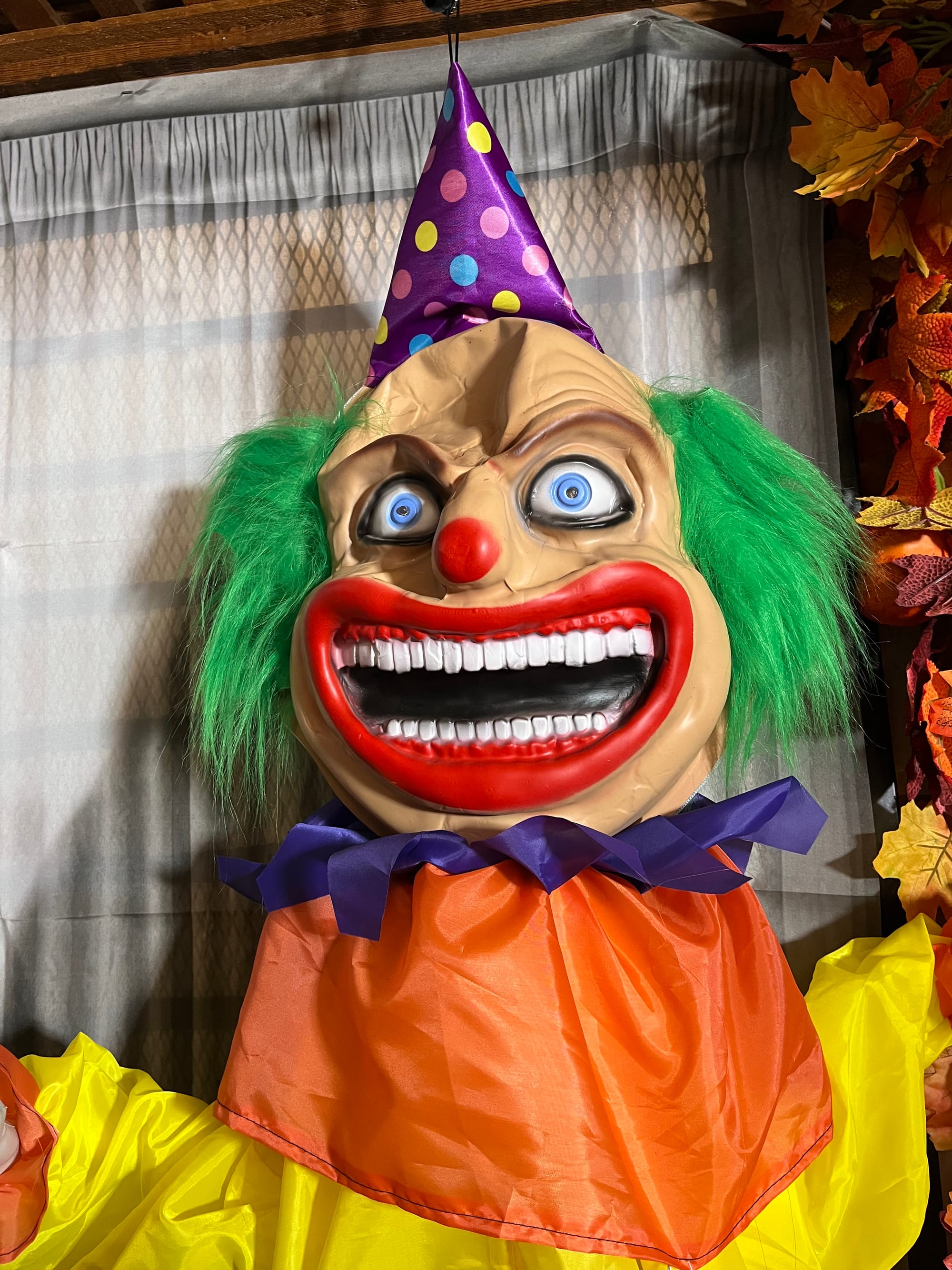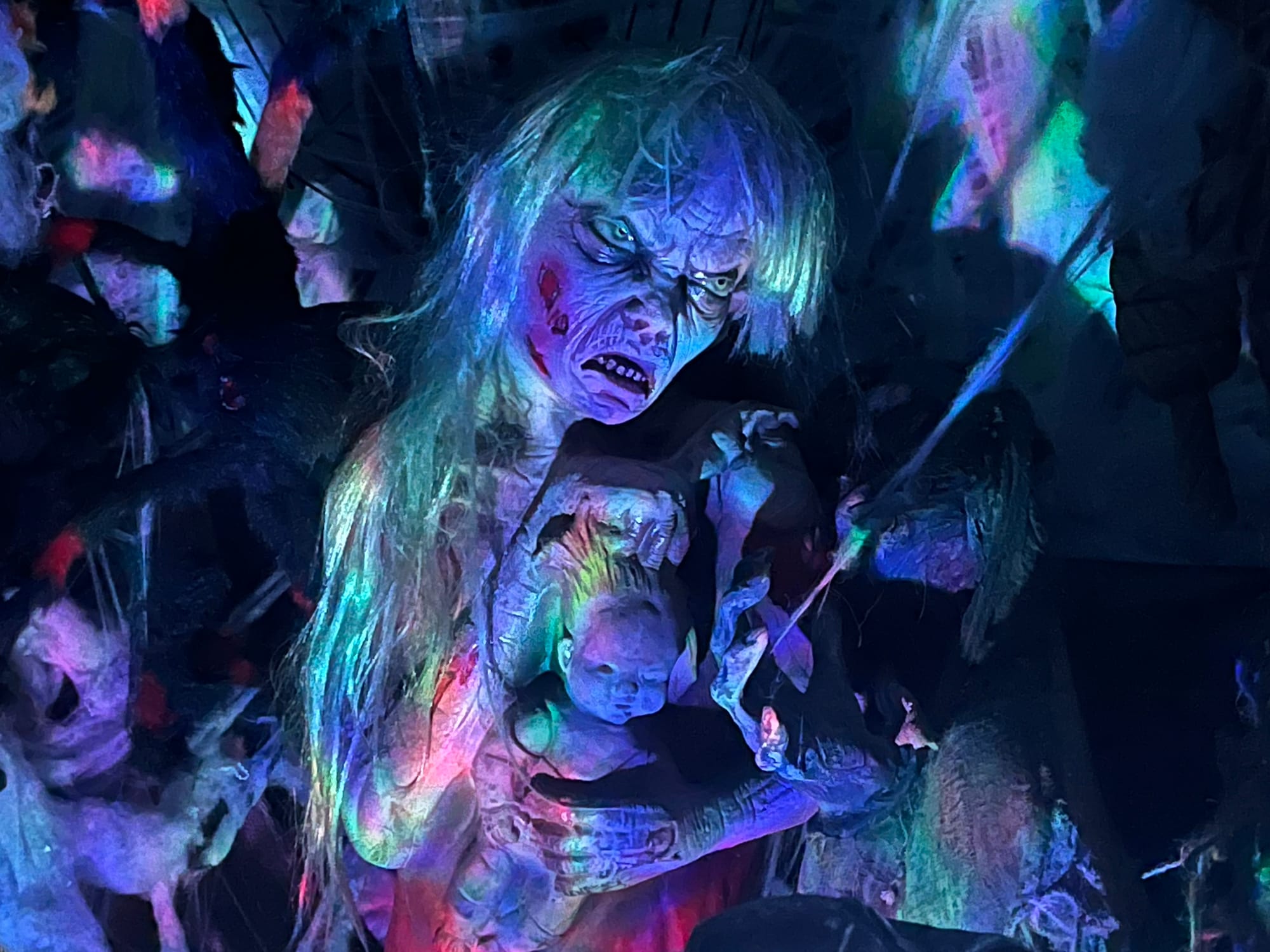 There are skulls and demonic clowns and creepy dolls with painted faces, a group of child figures circling in a “ring around the rosy” dance, windows that look in upon sinister tableaux that glow, snap, bang, and hiss; the sounds of crying babies, a portion with a disorientingly wobbly floor, and mannequins of the undead. And the coupe de grâce: a real human dressed as a harlequin complete with an ornate Venetian mask who giggles softly and menacingly at the end of a passageway as you approach. You’re unsure if it’s real or not until it leaps forward toward you. This is what made me yell. The young woman in the costume got me good!