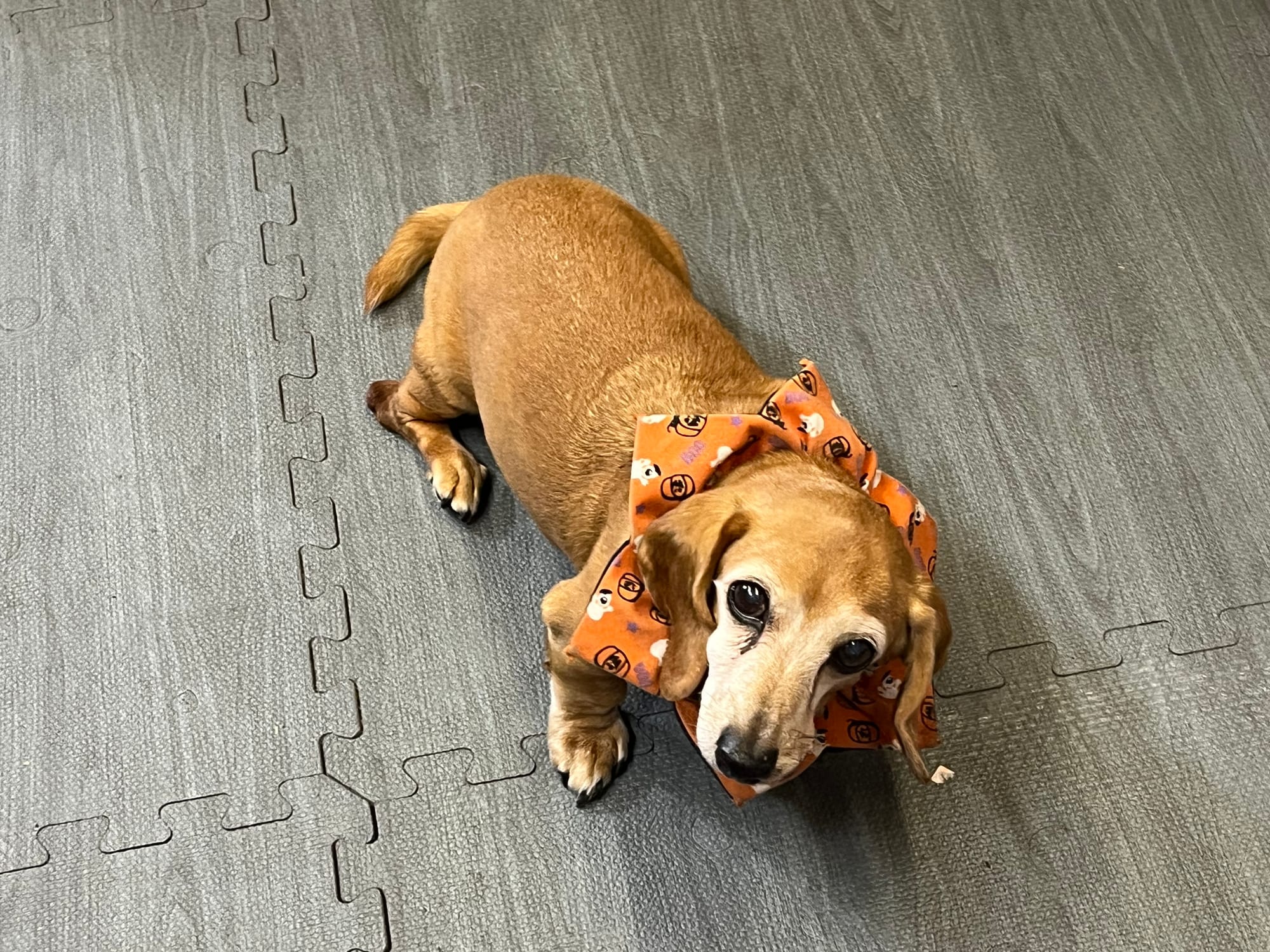 On our way out we had to pet “Pumpkin,” one of three dachshunds—Pumpkin, Goldie, and Kazar—that haunt the shop with their guileless cuteness. Definitely “Less Scary.”