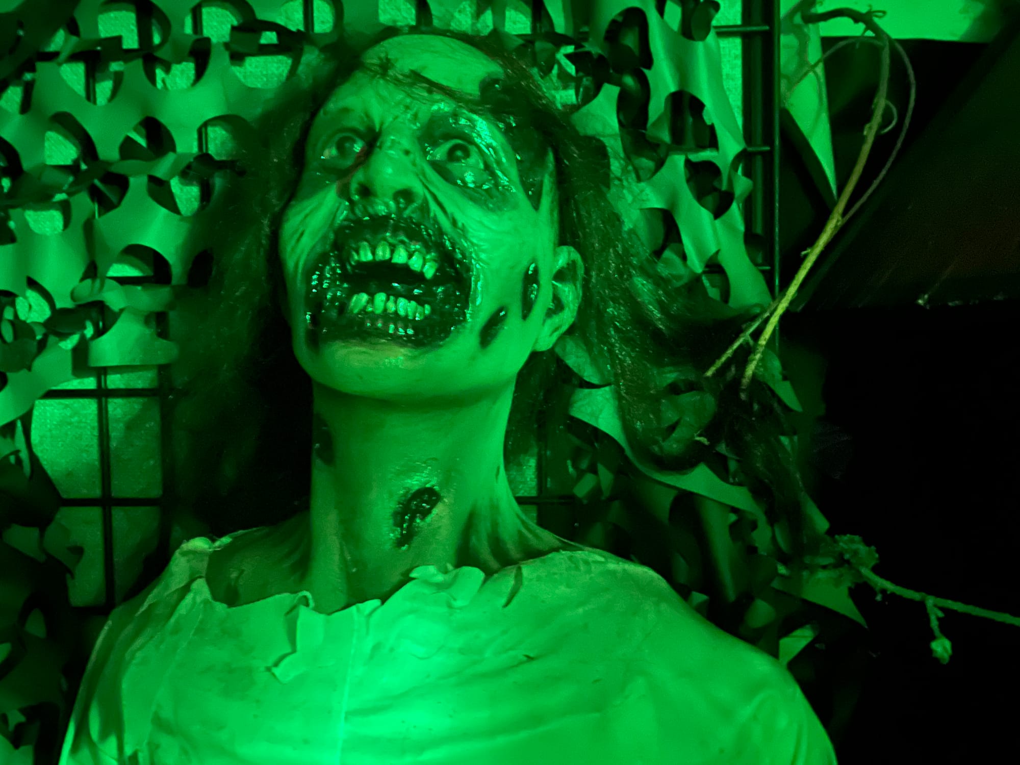 For these school groups and the youngest children (and scared adults), the attraction’s lights are kept on and the moving props disabled. Each evening there’s this “Less Scary” version, followed by the “Scary” version for the more intrepid. We chose the latter: my partner and I eagerly paid the $10 admission fee and shouldered our way through heavy, foreboding curtains and into the darkness.